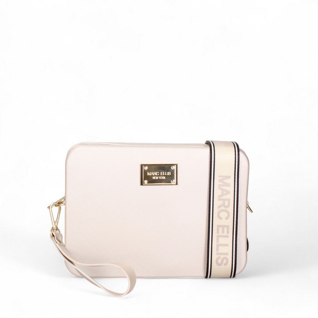 Shoulder bag Marc Ellis Flat Flowe in taupe PVC with monogrammed metal front badge. Features logoed fabric shoulder strap and PVC wrist strap, both removable. Zipper closure and gold electroplated details. Compact and versatile, ideal for urban and contemporary style. Dimensions: 24x17x5 cm. Perfect to complete any look with elegance.Our customer service is available Monday through Saturday from 10:00 AM to 7:30 PM