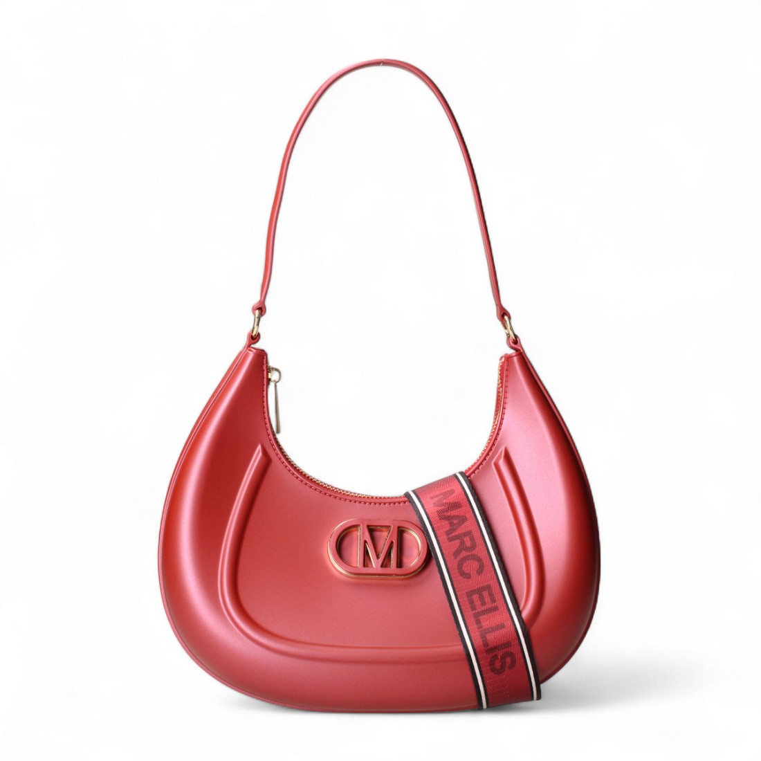 Stylish dahlia red PVC hobo shoulder bag with embossed monogram logo on front. Features removable and adjustable fabric shoulder strap and convenient zipper closure. Gold electroplating. Perfect for any occasion, it combines modern style and functionality in the compact size of 26x21x5 cm.