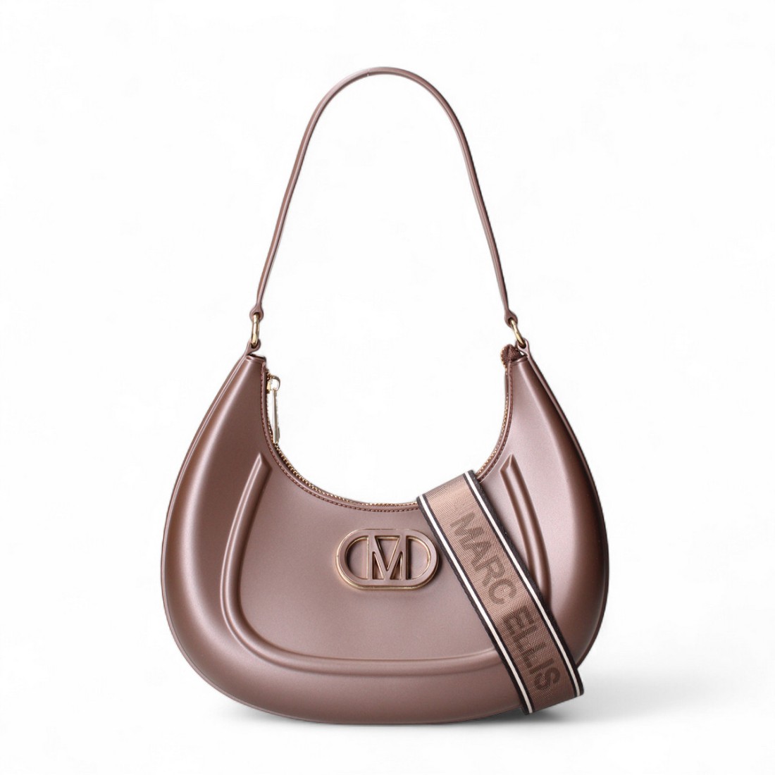 Stylish cocoa-colored PVC hobo shoulder bag with embossed monogram logo on front. Features removable and adjustable fabric shoulder strap and convenient zipper closure. Gold electroplating. Perfect for any occasion, it combines modern style and functionality in the compact size of 26x21x5 cm.Our customer service is available Monday through Saturday from 10:00 AM to 7:30 PM