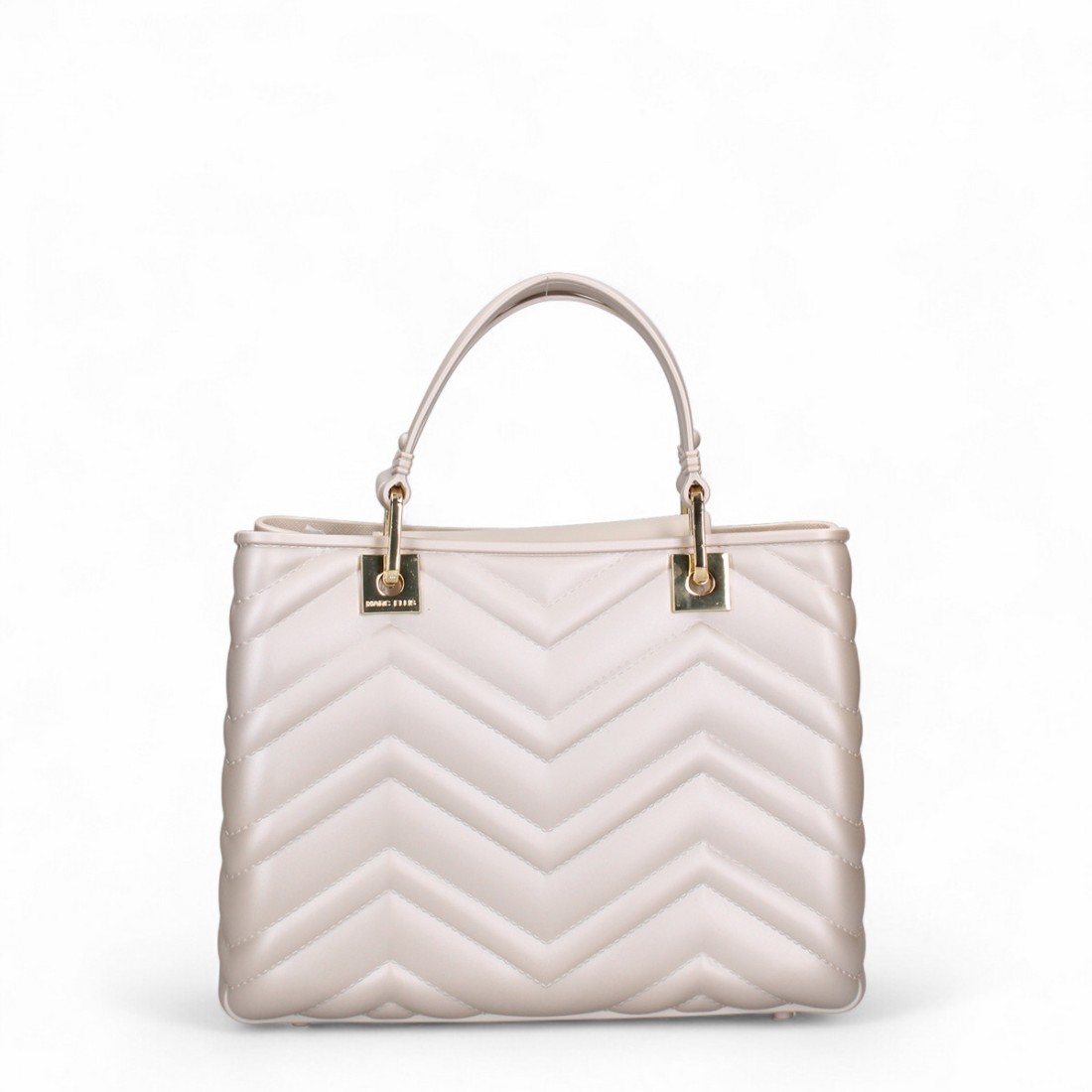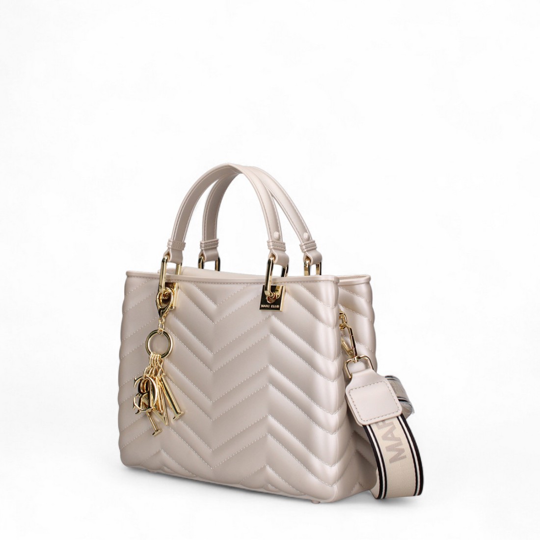Discover the wavy matelassé-effect taupe PVC handbag Marc Ellis, elegant and sophisticated. The removable logo charm adds a distinctive touch, while the PVC double handles and removable logo shoulder strap offer versatility. The buttonless interior flap closure provides practicality, complemented by gold galvanized details. Compact and functional, it measures 21x15x7 cm, perfect for any occasion.