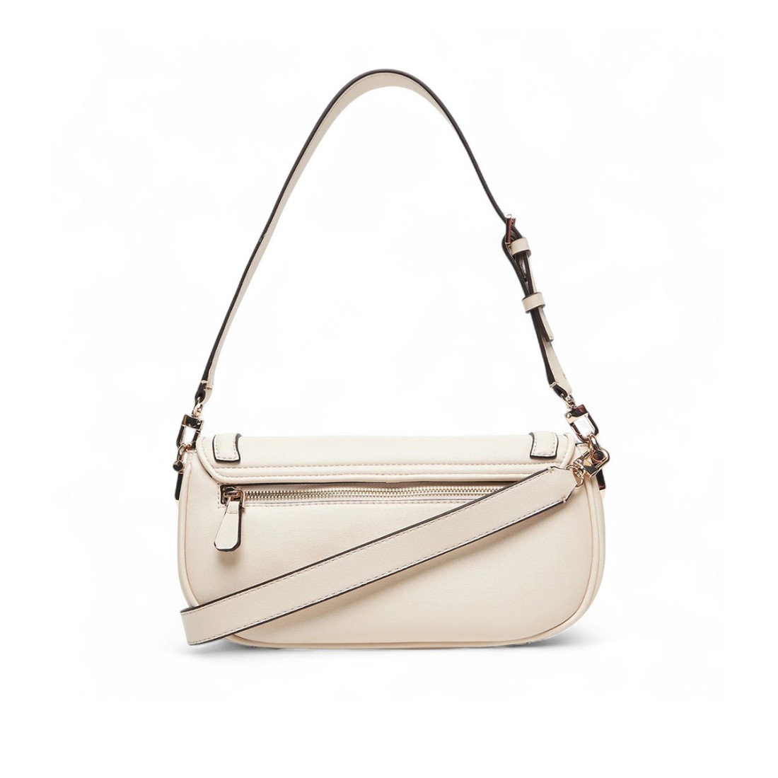 Elegant small bag Guess in white color, made of fine natural imitation leather. The rigid and compact design (29 x 15 x 6 cm) offers a refined and modern style. Features flap closure with magnetic clip, one main compartment, two zippered pockets and one flat pocket. Tall 26 cm handles and adjustable strap up to 130 cm for versatile comfort for any occasion.