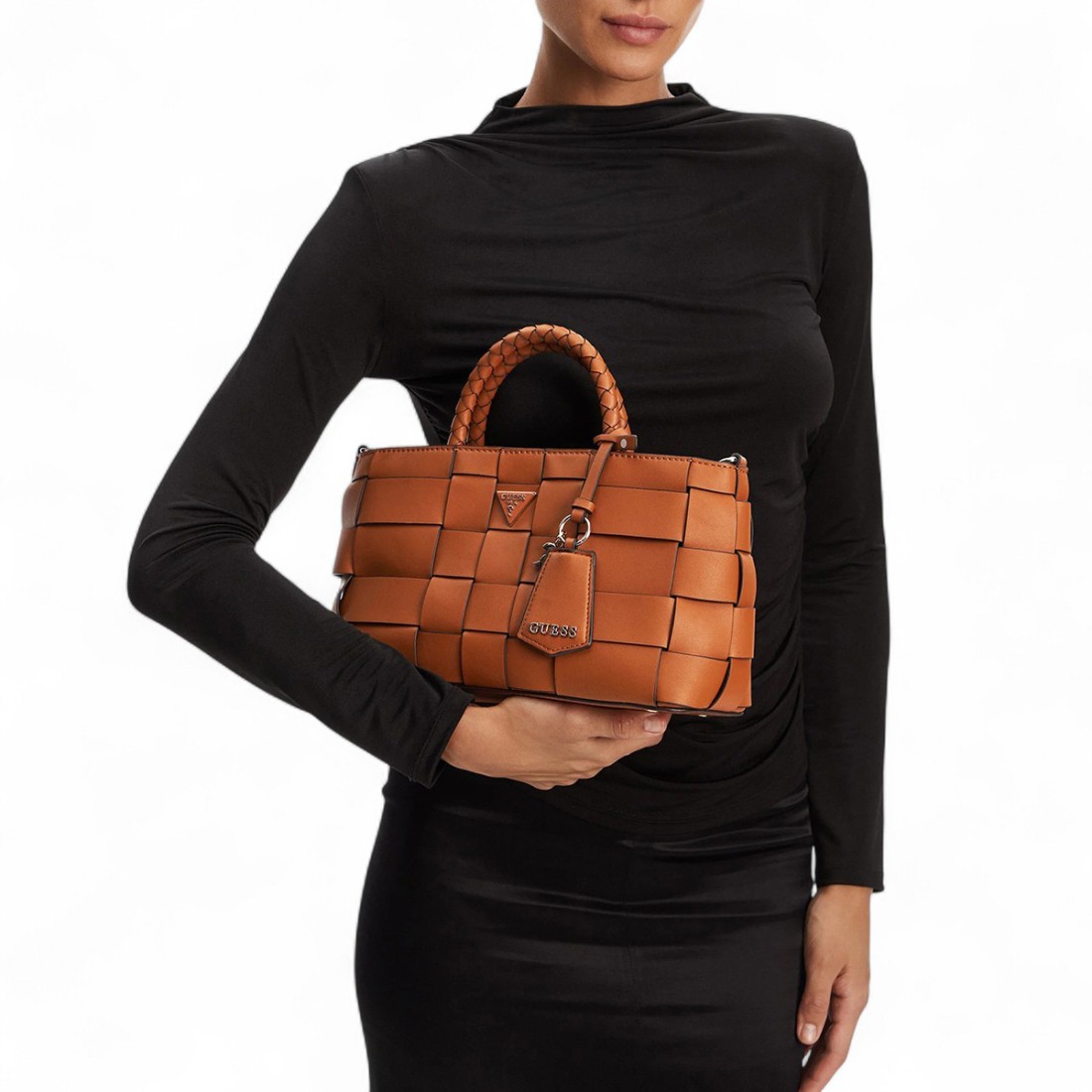 Sleekly styled handbag in textured faux leather. The Maylee from Guess features sleek woven handles and a removable thin shoulder strap for dual use. Finished with light gold-tone metal details, it offers a zippered closure to keep essentials secure. Dimensions: Approximately W31 x H18 x D12 cm.Our customer service is available Monday through Saturday from 10:00 AM to 7:30 PM