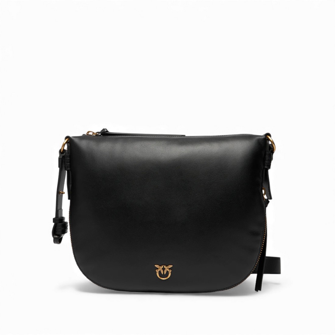 Soft leather medium hobo bag with a versatile and practical zip-around design. Featuring cotton lining and an adjustable strap for shoulder or cross-body wear, it is perfect to accompany any everyday look. The biker style and Love Birds Diamond Cut buckle enhance the distinctive character and contemporary elegance of the PINKO brand. Dimensions: 32x27x6 cm.