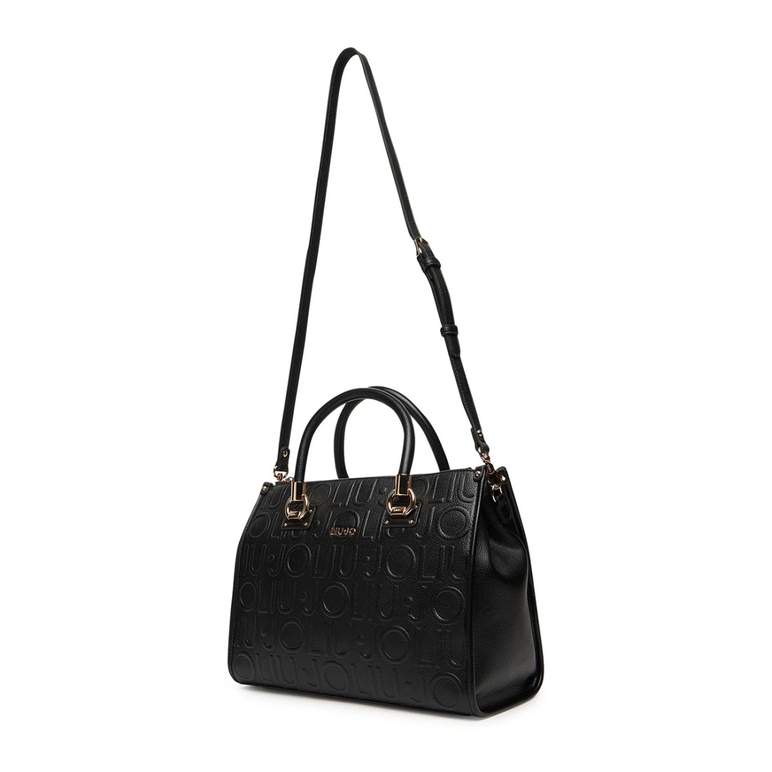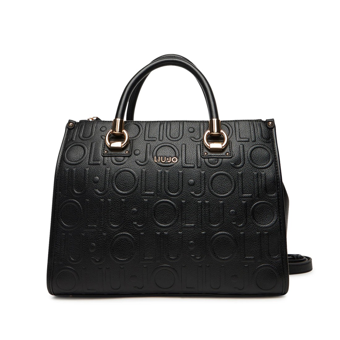 Elegant LIU JO black faux leather handbag with button effect print and all-over embossed logo. Features comfortable handles, adjustable and removable shoulder strap, two zippered compartments, inside pocket, metal feet and magnetic closure. Measures 34x15x25 cm, finished with metal logo and interior lining, ideal for a refined and versatile look.Our customer service is available Monday through Saturday from 10:00 AM to 7:30 PM