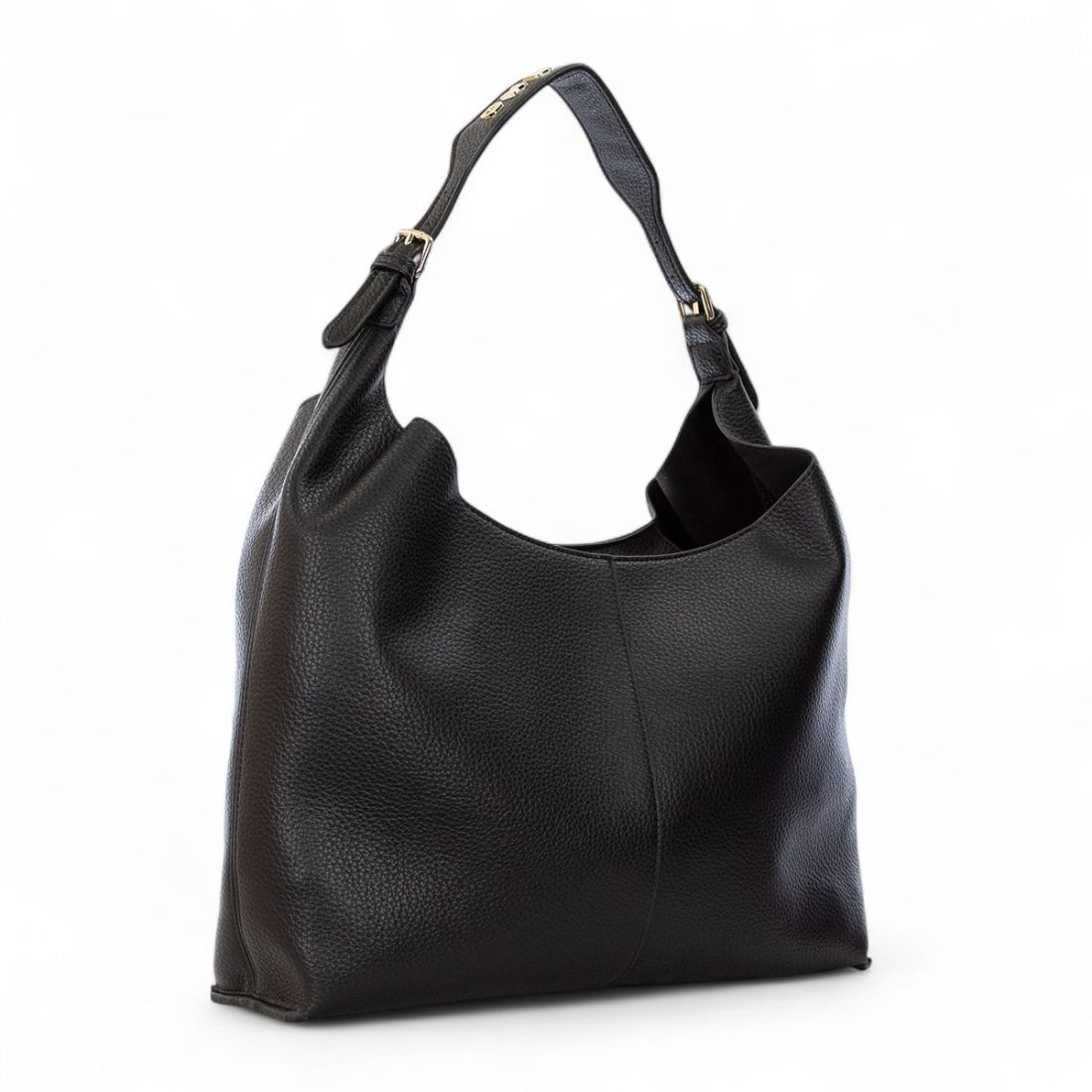Veronica hobo bag by Ermanno Scervino made of black grained faux leather, elegant and functional. The adjustable shoulder handle is embellished with the metal lettering logo, also embossed on the front. The zippered closure ensures practicality and security. Spacious and versatile, it is ideal to accompany everyday life in style. Dimensions: 40x37x11 cm.