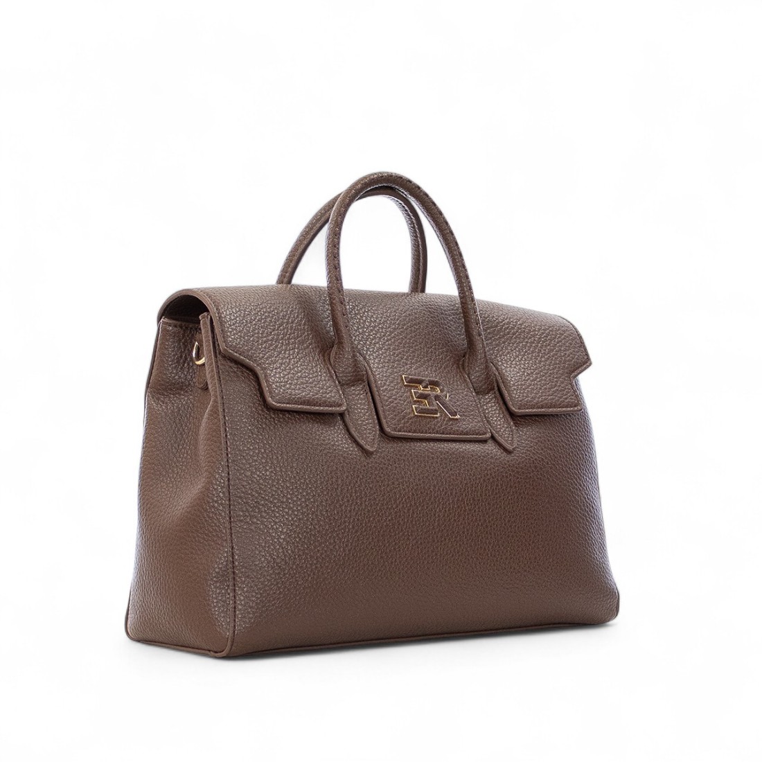 Brown faux leather handbag, stylish and practical. Measures 23 cm high, 32 cm wide and 10 cm deep. Equipped with clip and zipper closure, includes adjustable shoulder strap for comfortable shoulder use. Perfect for completing looks from the Fall-Winter collection with style and functionality.Our customer service is available Monday through Saturday from 10:00 AM to 7:30 PM