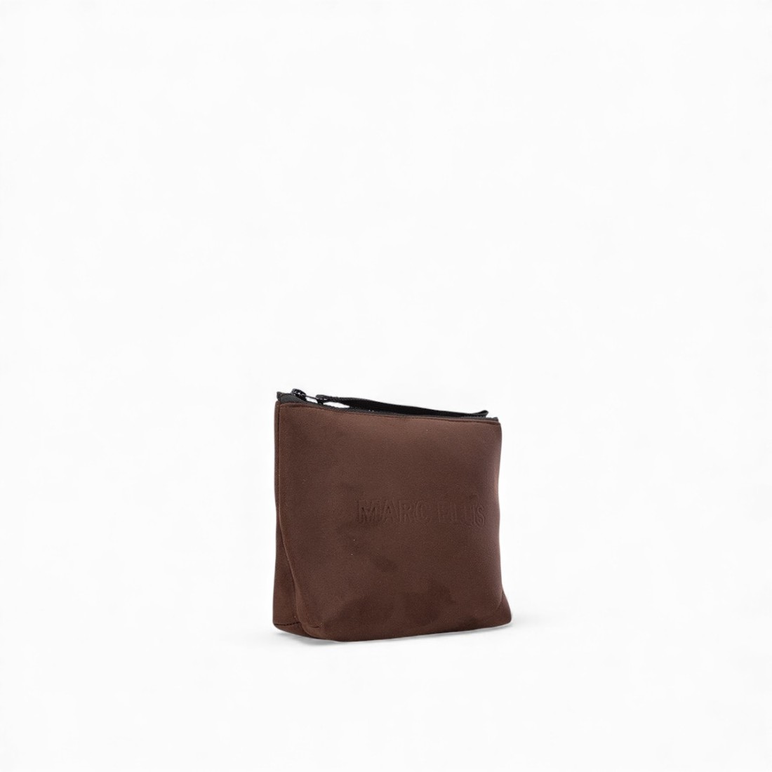Faux suede clutch bag with a soft touch, embellished with embossed lettering logo. The zippered closure features a practical zipper puller that doubles as a wristlet, ideal for having the essentials always at hand. Dimensions: 20x16x5 cm. Material: 100% polyester.Our customer service is available Monday through Saturday from 10:00 AM to 7:30 PM