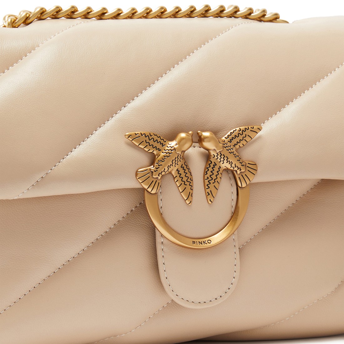 Pinko Classic Love Bag Puff shoulder bag in soft beige nappa leather, enhanced by maxi oblique quilting. Closure with iconic Love Birds Diamond Cut metal buckle. Suede-effect microfiber lined interior with zippered center partition and wall pocket. Round metal chain and tassel shoulder strap. Dimensions 26 x 17 x 11 cm.Our customer service is available Monday through Saturday from 10:00 AM to 7:30 PM