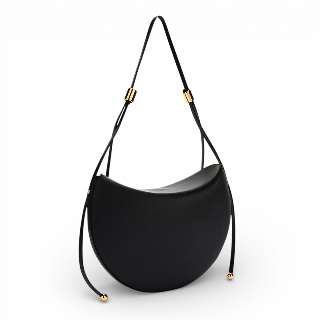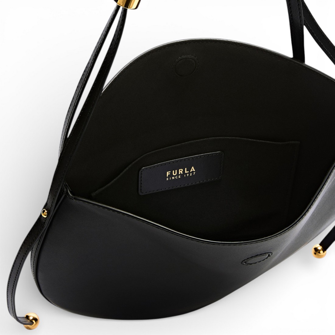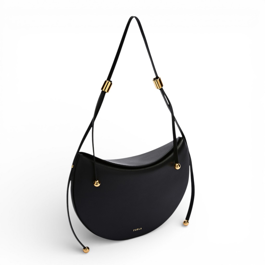 Soft lines and a saddle shape define Furla's Moonstone shoulder bag, made of smooth black calfskin that is pleasant to the touch. The fixed, adjustable shoulder strap allows it to be worn on the shoulder according to one's style. Cylindrical hardware with Sfera details lends a refined accent. Complete with open interior pocket and magnetic button closure. Dimensions: 30 x 20 x 2 cm.Our customer service is available Monday through Saturday from 10:00 AM to 7:30 PM