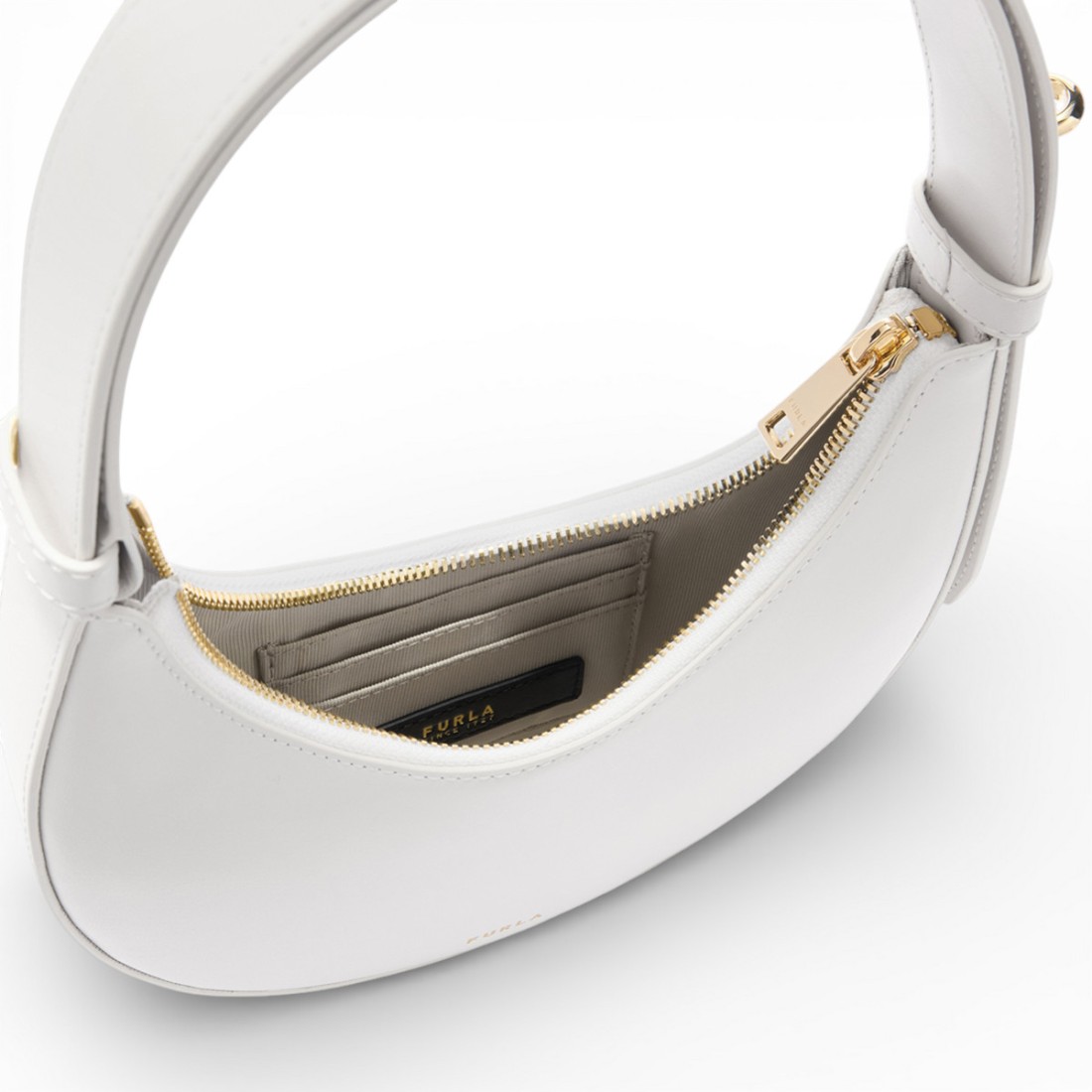 Compact in size but rich in style, this Furla Delizia is the perfect ally for carrying essentials with elegance. The rigid crescent-shaped silhouette enhances the soft talc-colored leather, smooth and silky to the touch. To be worn over the shoulder or by hand thanks to the adjustable shoulder strap with swivel, it features a zippered closure, three interior compartments for cards and documents and a printed logo on the front. Dimensions 20.5 x 12 x 3 cm.