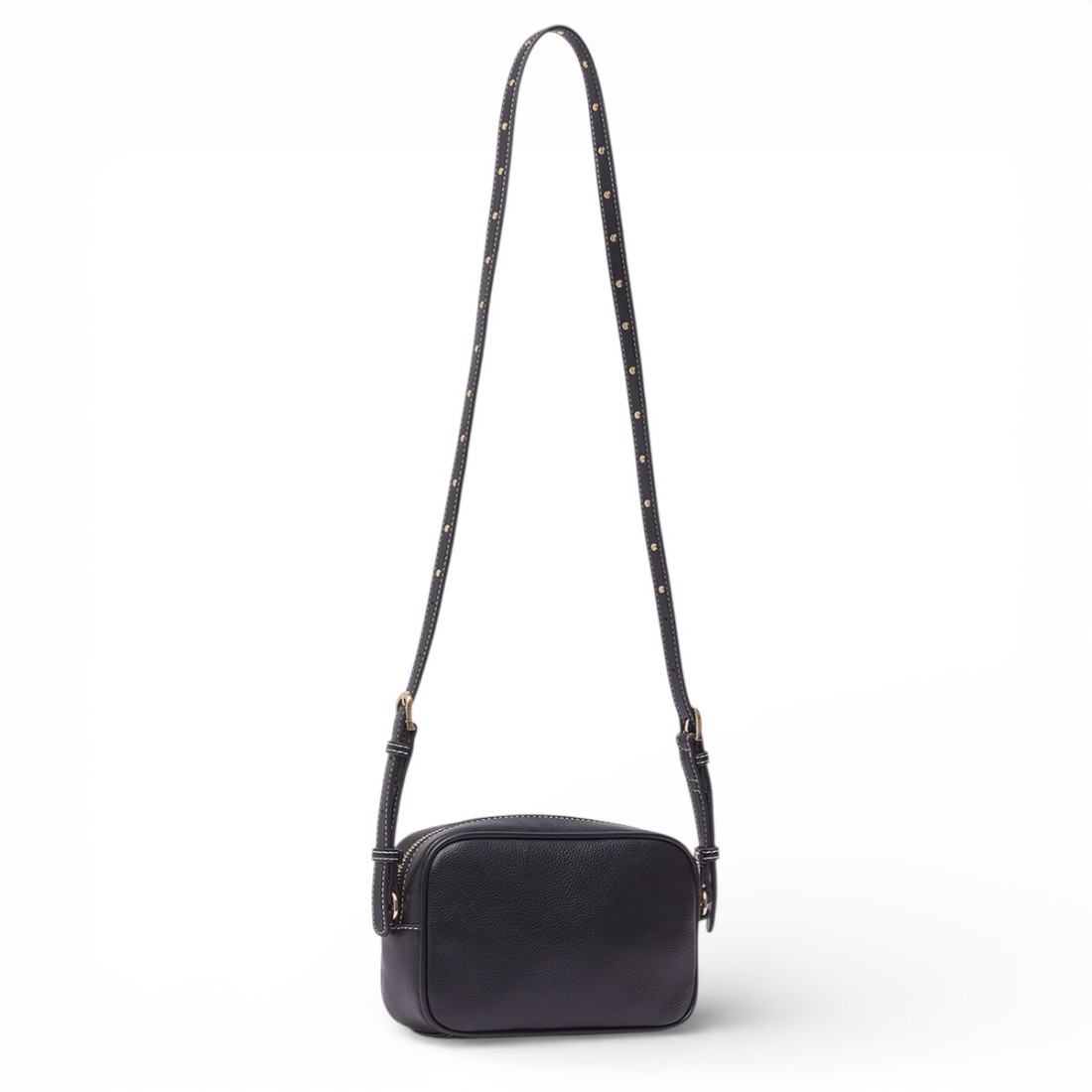 Stylish and versatile black buttoned-effect faux leather shoulder bag. Lettering logo embellishes the design, while the central zippered compartment provides security and practicality. The adjustable and removable faux leather shoulder strap with studded details allows it to be worn on the shoulder or cross-body according to the desired style. Compact yet roomy, it measures 21 x 6 x 14 cm, ideal for any occasion.Our customer service is available Monday through Saturday from 10:00 AM to 7:30 PM