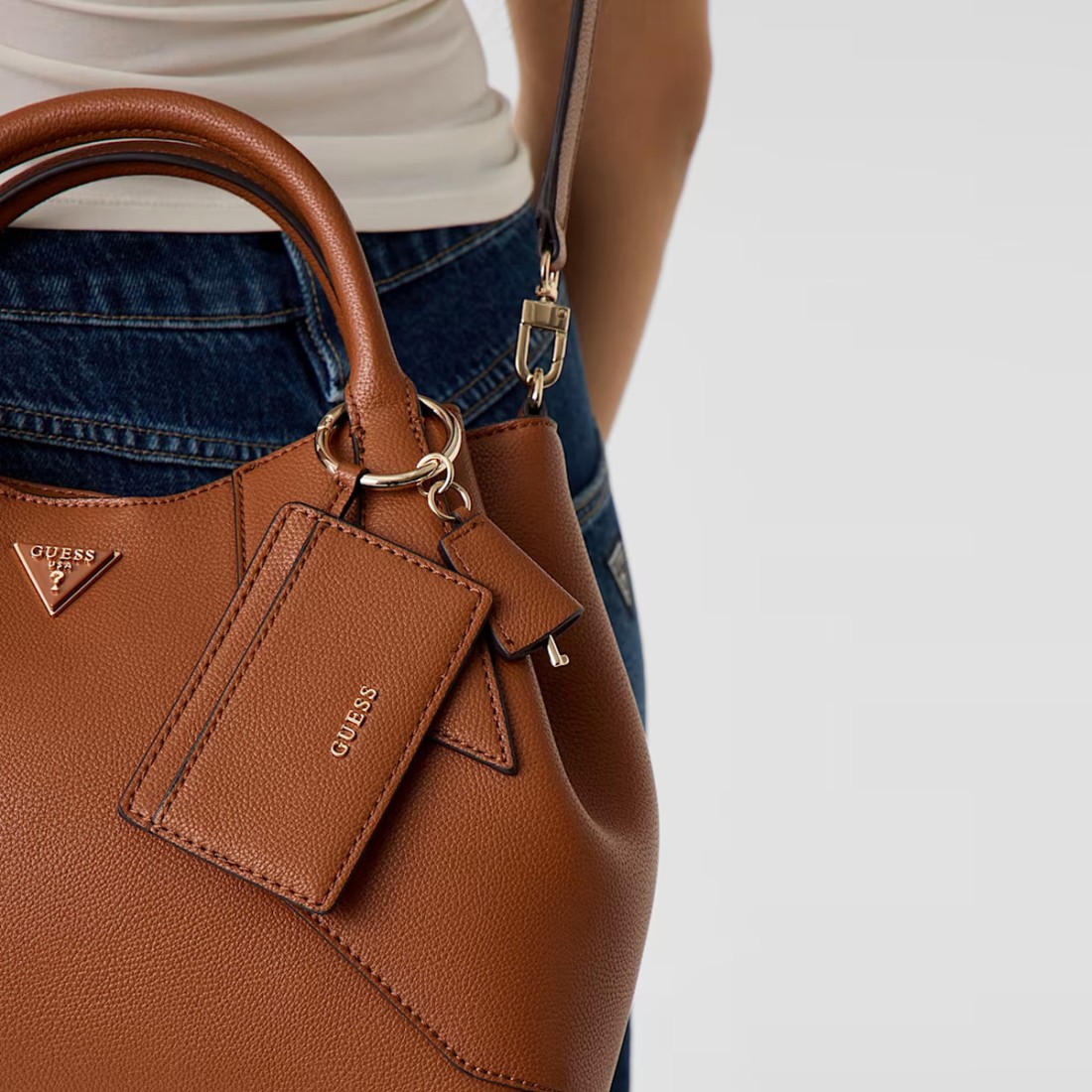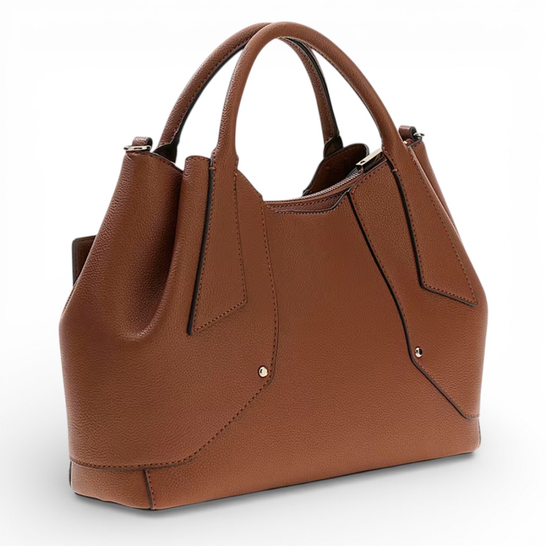 The Darcy handbag from Guess is made of cognac-brown tumbled-effect faux leather and features a front logo badge with decorative charm. Featuring double handles and an adjustable, removable shoulder strap, it offers versatility and comfort. The interior is organized with a central zippered compartment and two compartments with magnetic closure. Also includes a handy removable external card holder. Dimensions: 37x25x12 cm.Our customer service is available Monday through Saturday from 10:00 AM to 7:30 PM