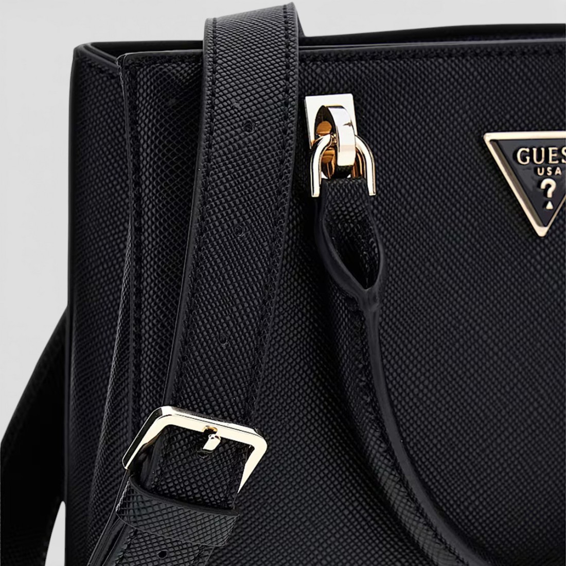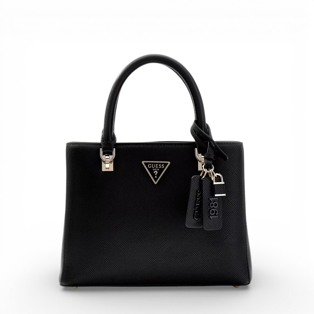 Black saffiano-effect faux leather Noelle handbag with removable logo badge and logo charm. Equipped with double handles and adjustable and removable shoulder strap for perfect versatility. The compact size of 25x12x19 cm makes it ideal for everyday use, combining practicality and style for any casual occasion.Our customer service is available Monday through Saturday from 10:00 AM to 7:30 PM
