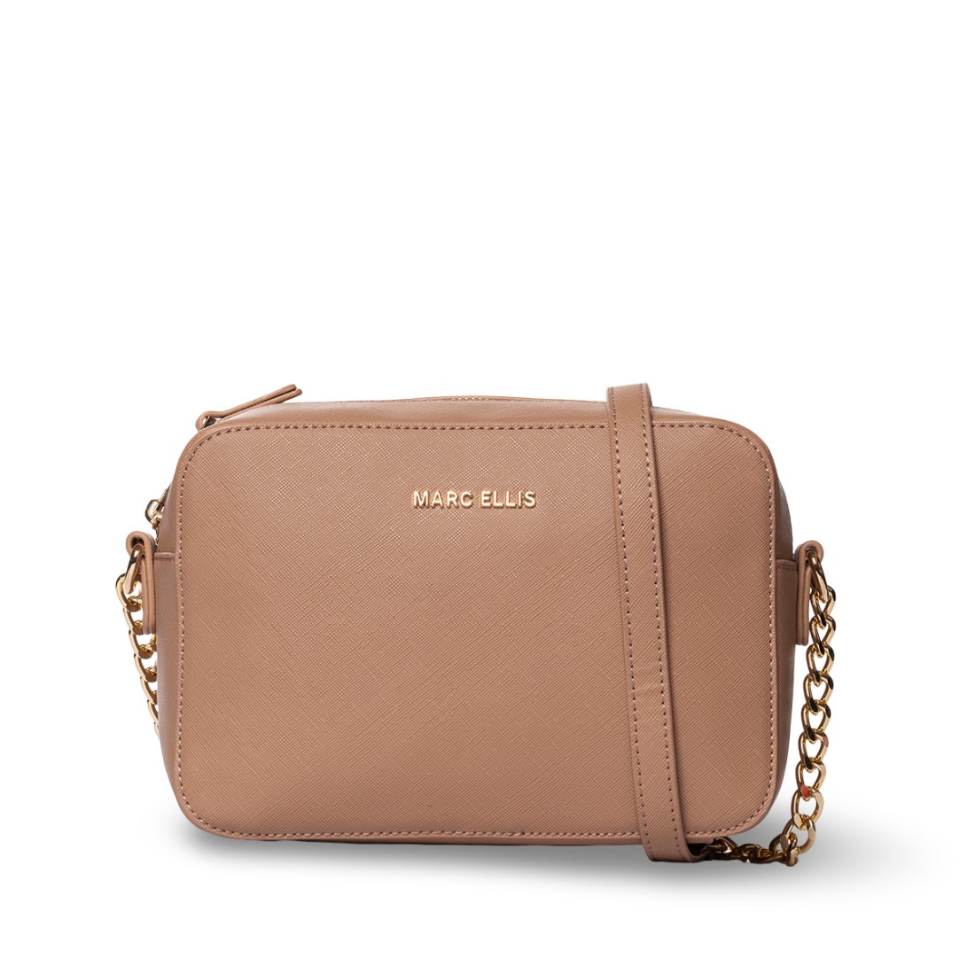 Elegant and versatile, the MARC ELLIS Peyton MF shoulder bag in cream coffee-colored saffiano-effect faux leather combines style and practicality. The lettering logo on the front adds a distinctive touch, while the adjustable, removable shoulder strap in faux leather or logo fabric allows you to personalize the look. Compact yet roomy, with a zippered closure, it measures 22 x 15 x 8 cm and is perfect for day and evening wear.