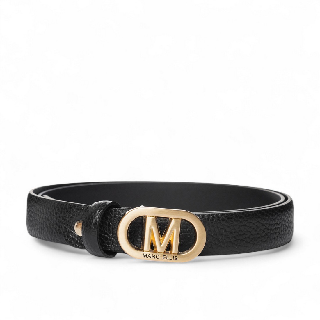 Belt Marc Ellis in genuine black leather, elegant and versatile, perfect for adding a touch of style to any outfit. Metal monogram logo buckle enhances the refined and contemporary design. Height 2.3 cm, ideal for casual or formal looks.
