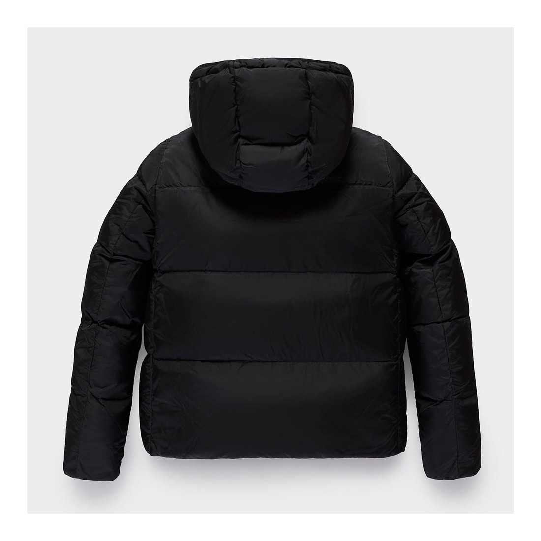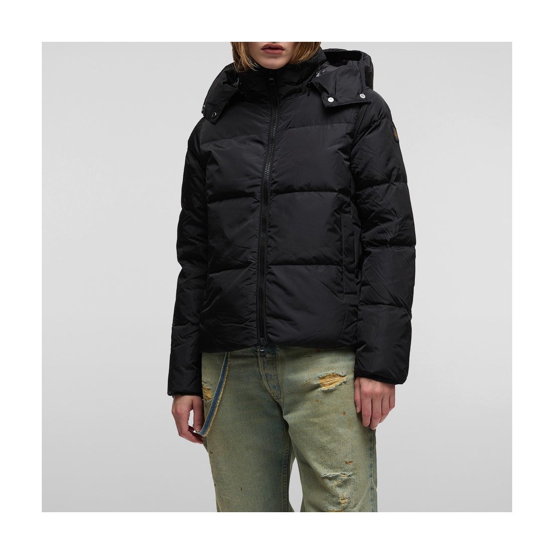 Women's winter down jacket with a modern and slightly oversized design, ideal for a contemporary and comfortable look. The 90-10 down filling ensures warmth and softness even on the coldest days. Made of satin nylon, it gives a refined elegance and a bright touch. The high collar and removable hood offer practicality and versatility, perfect for any winter occasion.