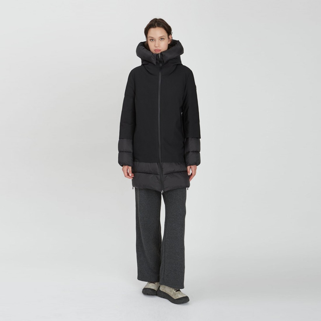 The perfect blend of down jacket and coat, the Canadian Becancour Long is the ideal outerwear to face winter in style. Made of water-repellent and breathable black nylon, it features a zipper closure, integrated hood and refined contrasts between shiny and matte surfaces. Soft and comfortable, it brings elegance to even the most sporty looks thanks to its sophisticated and versatile design.