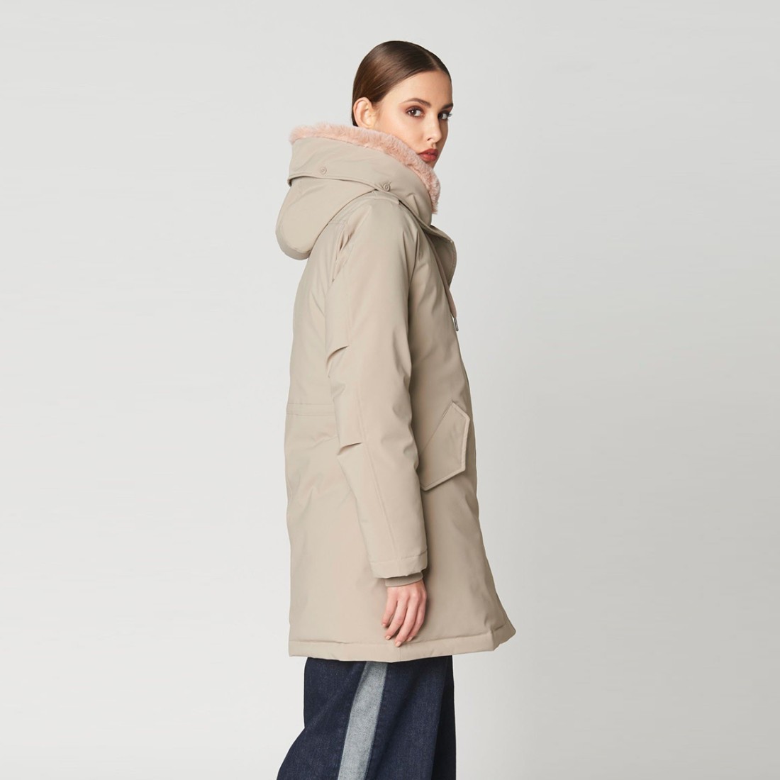 Lanigan Tech jacket: warm, lightweight and impeccably styled. The beige 100% polyester technical fabric with synthetic padding offers comfort and protection on colder days. Faux fur details, double zipper with snaps and adjustable hood enhance a sleek, modern design. Perfect with jeans or more refined looks, it brings a touch of class to winter.