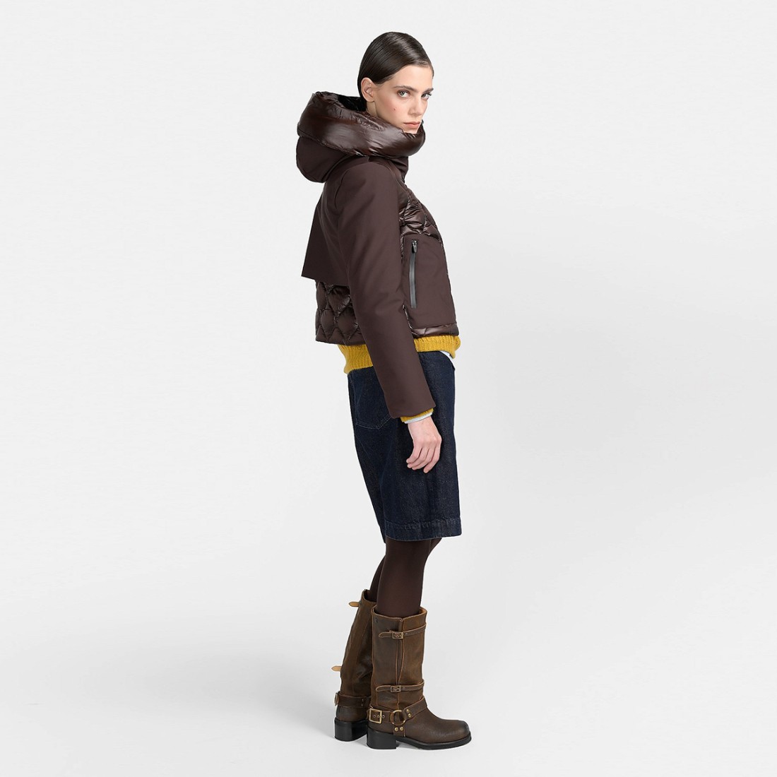 Canadia's Corey Jacket is a short, sporty jacket perfect for mid-seasons. Made of water-resistant Urban Lux Tech fabric in black coffee color, it combines comfort, durability and modern style. The lightweight padding provides warmth without weighing you down, while the feminine cut gives a harmonious silhouette. Ideal for elegantly accompanying you on your daily commute.