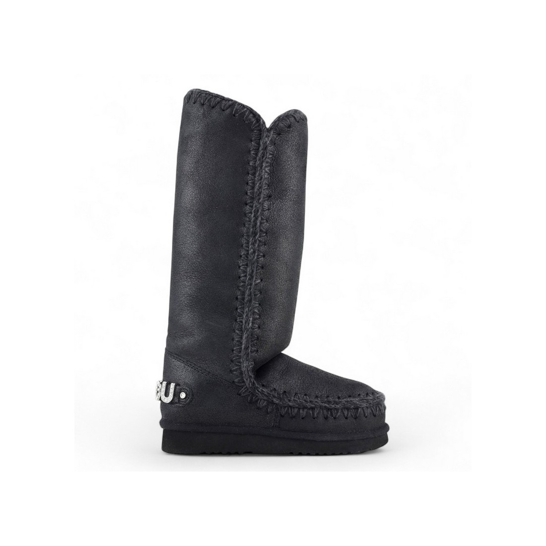 MOU Eskimo 40 Rhinestones Logo boot in black cracked leather with crochet stitching and rhinestone-embellished Mou metal logo on the back. Soft double-face sheepskin interior provides comfort and warmth in any season. Durable rubber sole, perfect for a distinctive and refined look for everyday wear.