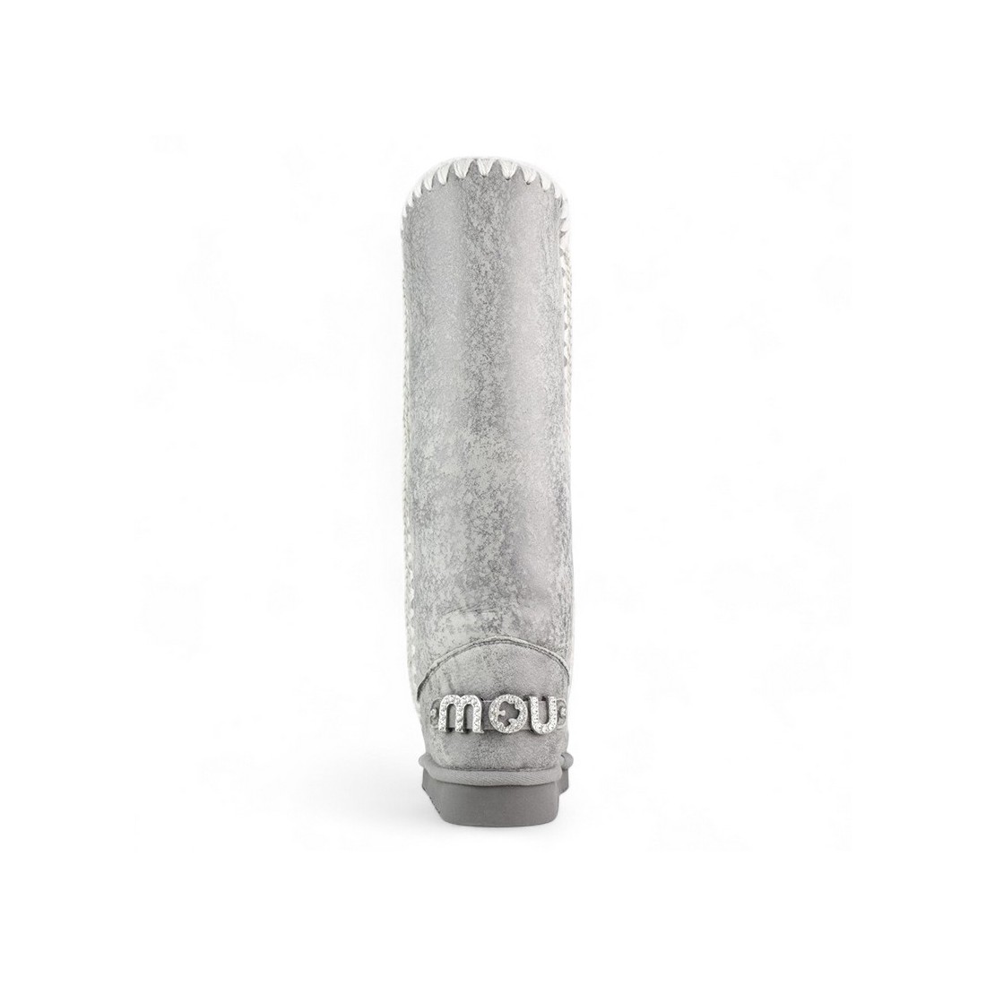 MOU Eskimo 40 Rhinestones Logo boot in silver silk-effect leather with crochet stitching and rhinestone-embellished metal Mou logo on the back. Soft double-face sheepskin interior provides comfort and warmth in any season. Durable rubber sole perfect for a distinctive and refined look for everyday wear.