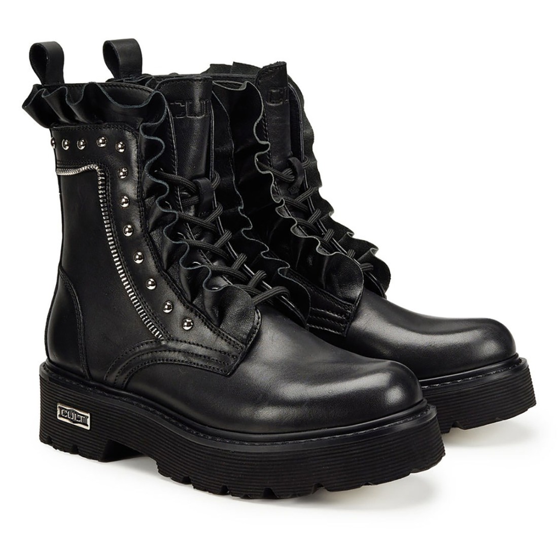 Cult amphibians combine essentiality and character, perfect for making every look unique. Smooth black leather is enriched with ruffles, zippers and spherical studs, creating a bold detail on monochromatic dresses or cropped pants. Comfort and style in one iconic model.Our customer service is available Monday through Saturday from 10:00 AM to 7:30 PM