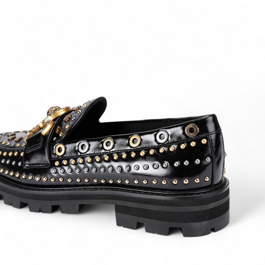 Mansion Stud black patent leather loafer with antiqued brass and silver studs on the upper. The unique design is enhanced by an antiqued brass clamp-style chain with a central eagle head for an elegant, bold look. Moccasins ideal for standing out with character and style on any occasion.Our customer service is available Monday through Saturday from 10:00 AM to 7:30 PM
