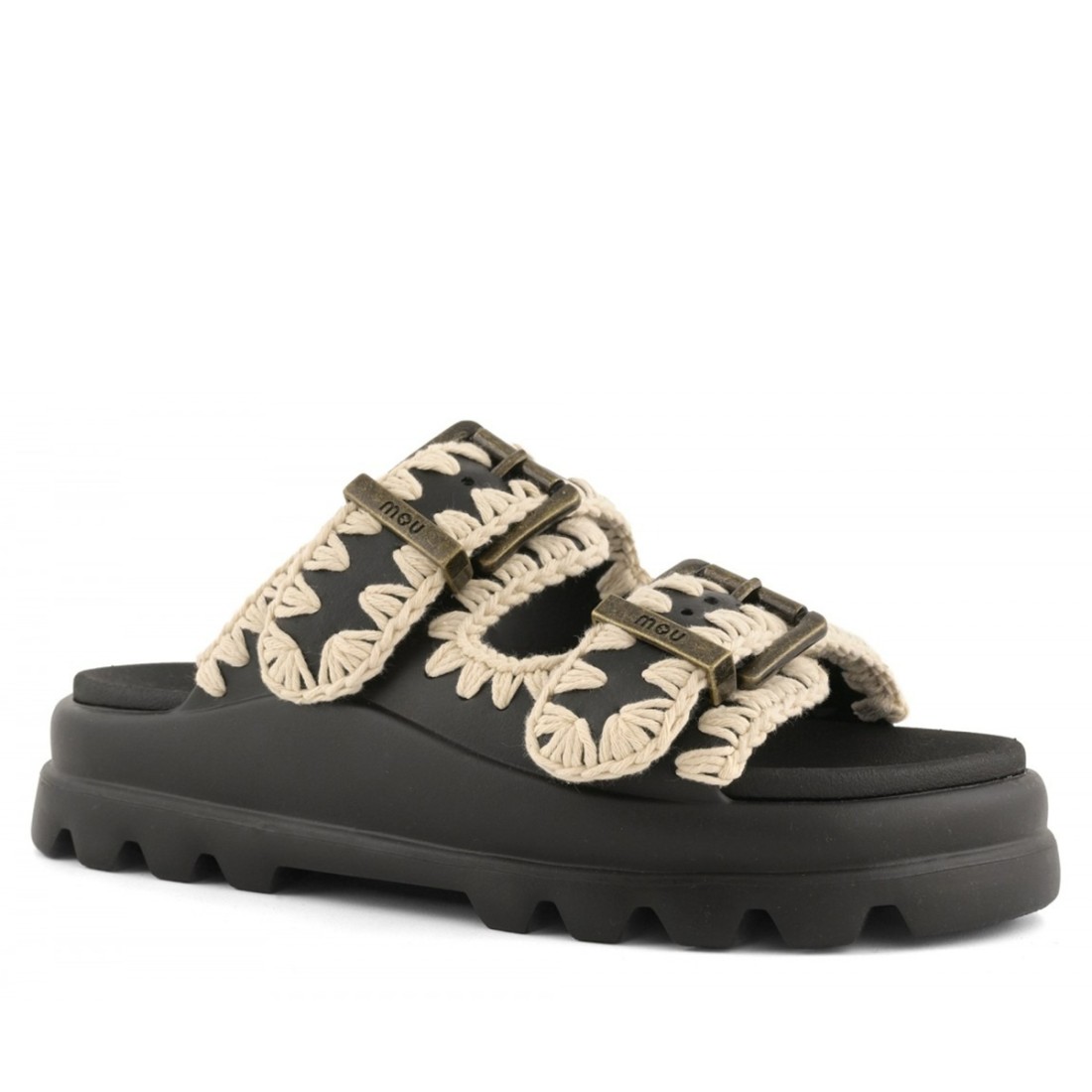 Discover MOU, the black EVA rubber sandal with double strap and crochet stitching that gives a unique touch. The double buckle allows you to easily adjust the fit, ensuring comfort and style. The rubber bottom ensures durability and grip. Perfect for those looking for a versatile and trendy sandal ideal for any occasion.Our customer service is available Monday through Saturday from 10:00 AM to 7:30 PM