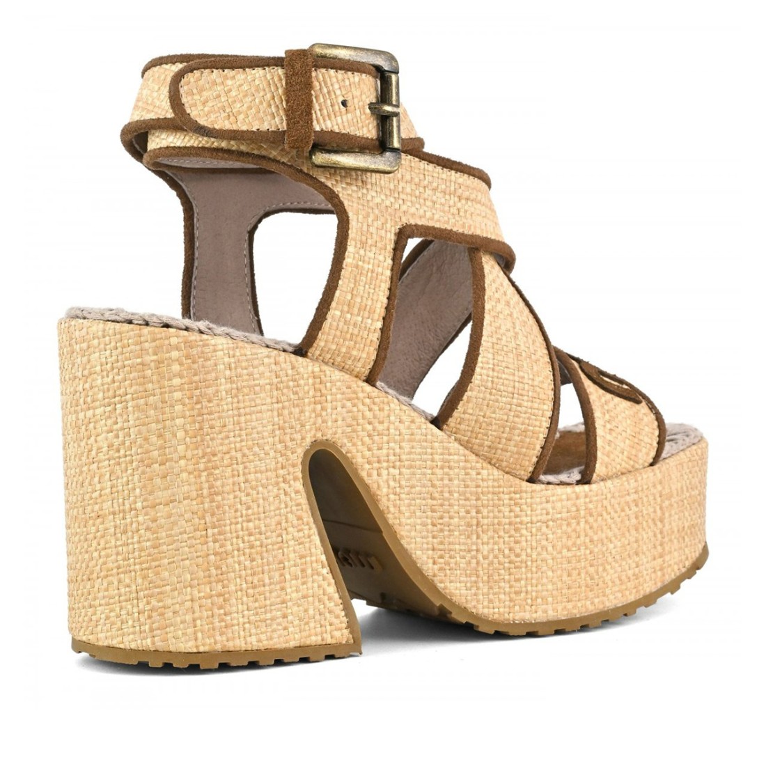 Sandal Mou in natural beige raffia with refined brown suede piping and embossed lettering logo on the upper. The ankle strap with metal buckle ensures a stable fit. The 95 mm heel, combined with the 40 mm platform, slims the figure while maintaining comfort. Rubber bottom for a secure and versatile walk.Our customer service is available Monday through Saturday from 10:00 AM to 7:30 PM