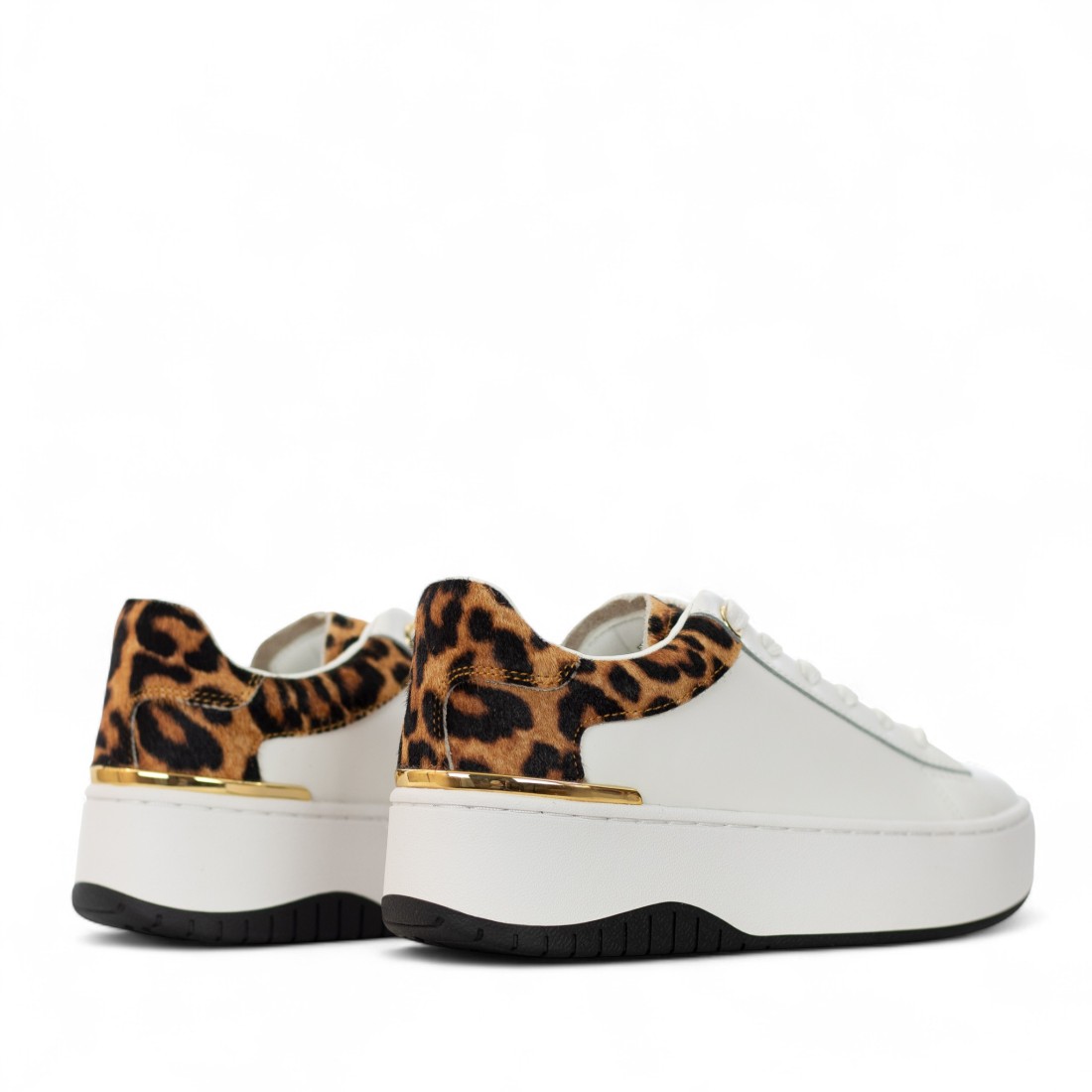 Sneakers Michael Kors Dottie Lace Up white leather sneakers with mini monogram logo on the front and animal-effect pony skin fabric details. 50mm high sole on the back and 40mm on the front, made of durable rubber. Fabric lining and insole for everyday comfort. Perfect for modern and refined style, combining elegance and practicality in every step.