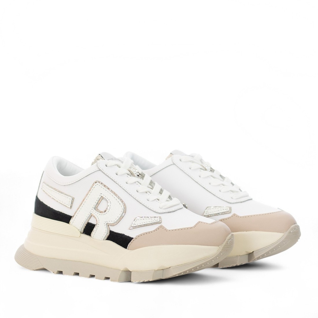 Women's sneakers Rucoline in white leather, with black suede details on the upper for an elegant touch. The 7.5-cm high bottom enhances the silhouette, while the fabric and faux leather lining and insole provide lasting comfort. The rubber sole provides stability and durability. A refined and versatile model, ideal for enriching your every look with style.