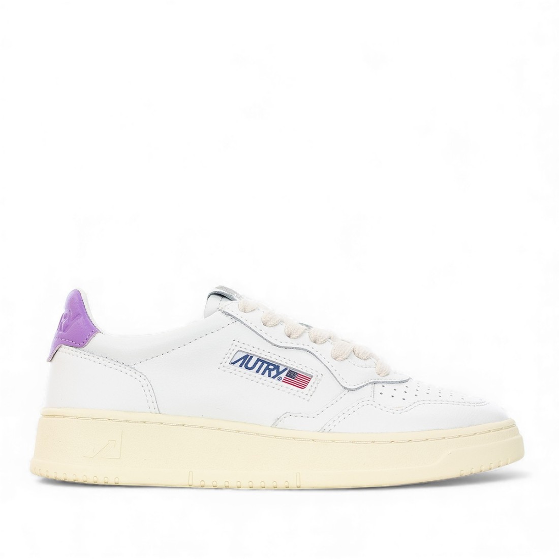 White leather upper with multilayer inserts defined by stitching and perforated toe for breathability. Cotton flat laces, padded tongue and collar, leather and cotton terry lining. Logo insole raised 2 cm, rubber outsole 2.5-3.5 cm. Iconic lilac logo heel on the back.Our customer service is available Monday through Saturday from 10:00 AM to 7:30 PM