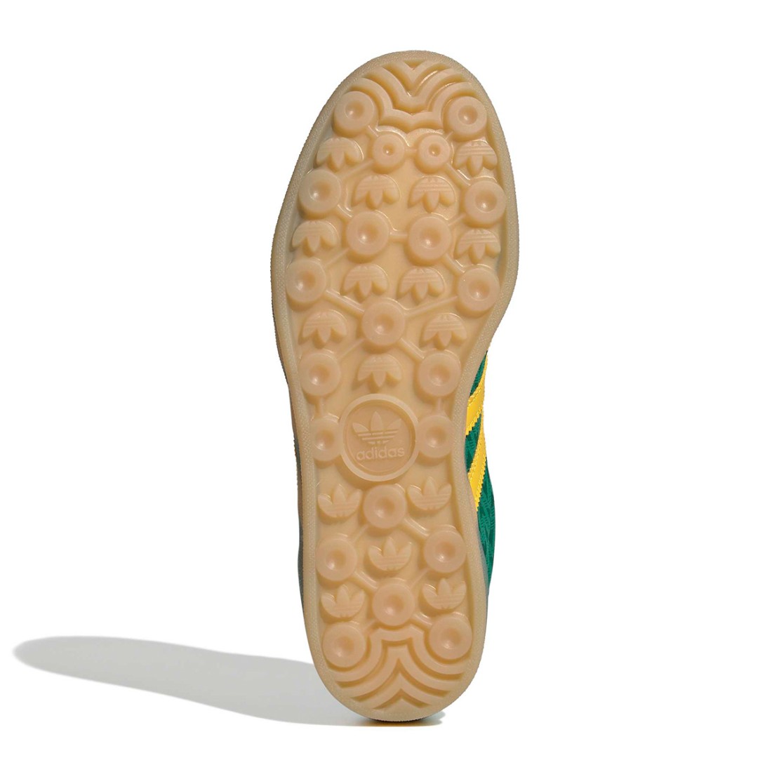 A timeless icon, the Adidas Gazelle Indoor began as a training shoe in the 1960s and continues to stand out today. Green fabric upper with green suede inserts and yellow serrated 3-Stripes. Unmistakable flat natural rubber outsole. Versatile and rich in history, it is an archival model that has entered adidas sneaker legend.