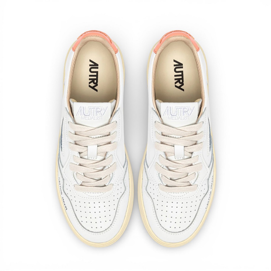 Autry Medalist Low in white leather, inspired by 1980s tennis, combines heritage taste and current style. Clean lines, micro-perforated toe for added breathability and everyday comfort. Peachy pink heel, jacquard detail and "Floating Dreams" side lettering sign the look. Versatile and timeless, perfect for every day.Our customer service is available Monday through Saturday from 10:00 AM to 7:30 PM