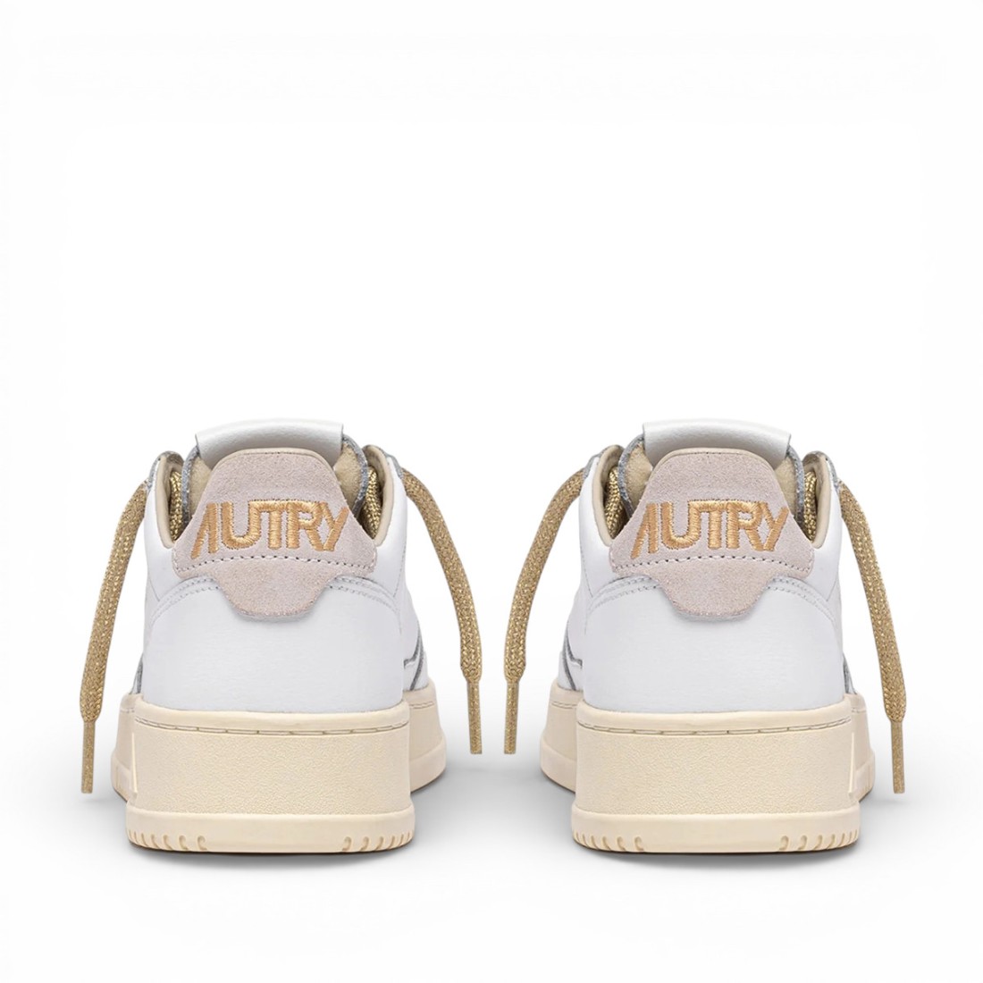 The Medalist Autry revisits the 1980s tennis style with current elegance. In soft white leather, it features laminated puffy laces and gold logos that add a bright touch. The beige suede heel with embroidered logo completes a versatile and refined sneaker, perfect for everyday wear between comfort and timeless style.Our customer service is available Monday through Saturday from 10:00 AM to 7:30 PM