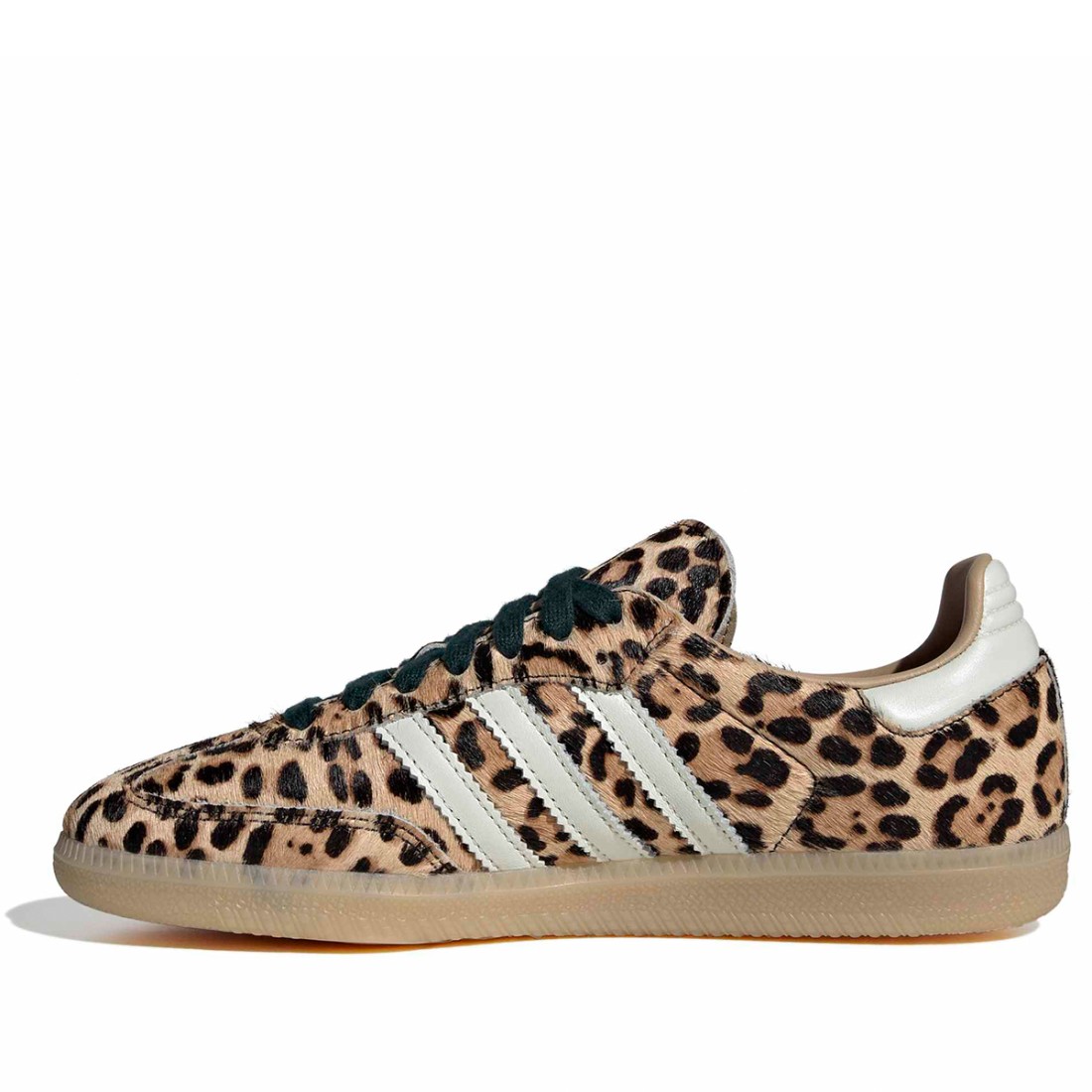 Leopard print dominates the season, and these adidas Samba shoes don't go unnoticed. The animal-print pony hair upper lends character, while the deep green laces and ivory 3-Stripes create a stylish contrast. Lace-up closure, logo details and rubber sole complete the look, for an Originals icon revisited with bold style.Our customer service is available Monday through Saturday from 10:00 AM to 7:30 PM