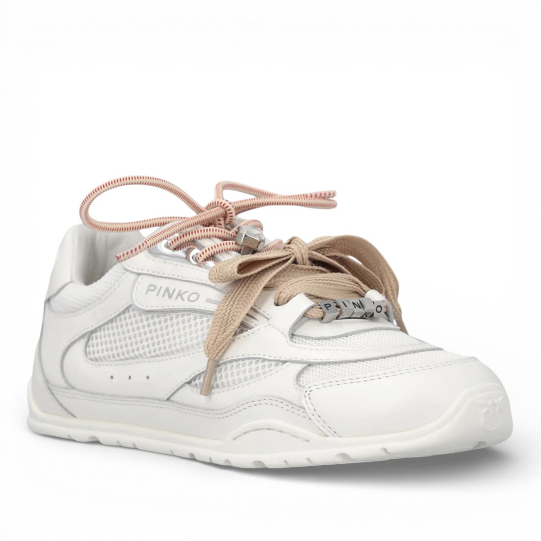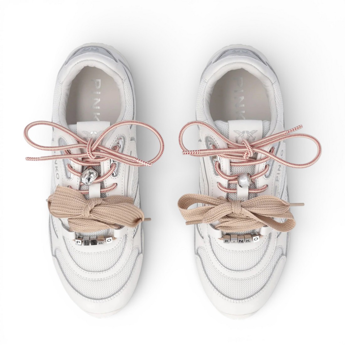 Mesh sneakers with white leather inserts and contrasting double laces, different in shape and color, for a sophisticated look. Love Birds logo finishes mirrored tongue and heel, while PINKO lettering embellishes front metal rings. Jeweled details and marbled charm add character. Inner lining with 10mm latex fussbett and non-slip rubber sole for comfort and everyday glam style.Our customer service is available Monday through Saturday from 10:00 AM to 7:30 PM