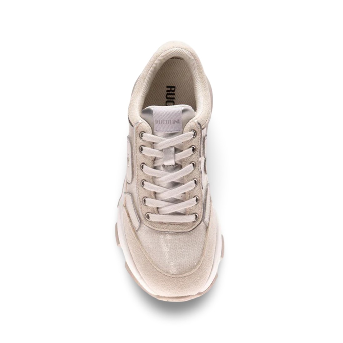 RUCOLINE sneakers with a bright and contemporary look, made with a white sequin upper and beige suede and white faux leather inserts. The embossed monogram logo on the side adds a distinctive touch. Practical thanks to the lace-up closure and side zipper, they are complemented by a 55 mm rubber bottom that ensures comfort and momentum to the figure.