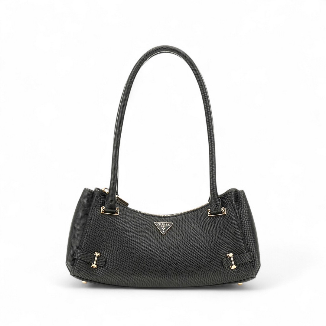 Descubre el bolso bandolera de piel sintética GUESS Rosalba con una refinada confección en saffiano. Elegante y práctico, cuenta con cierre de cremallera, herrajes metálicos en tono plateado y el icónico triángulo metálico del logotipo en la parte delantera. Con unas dimensiones de 28x15x11 cm, es perfecto para completar tu look diario con estilo.