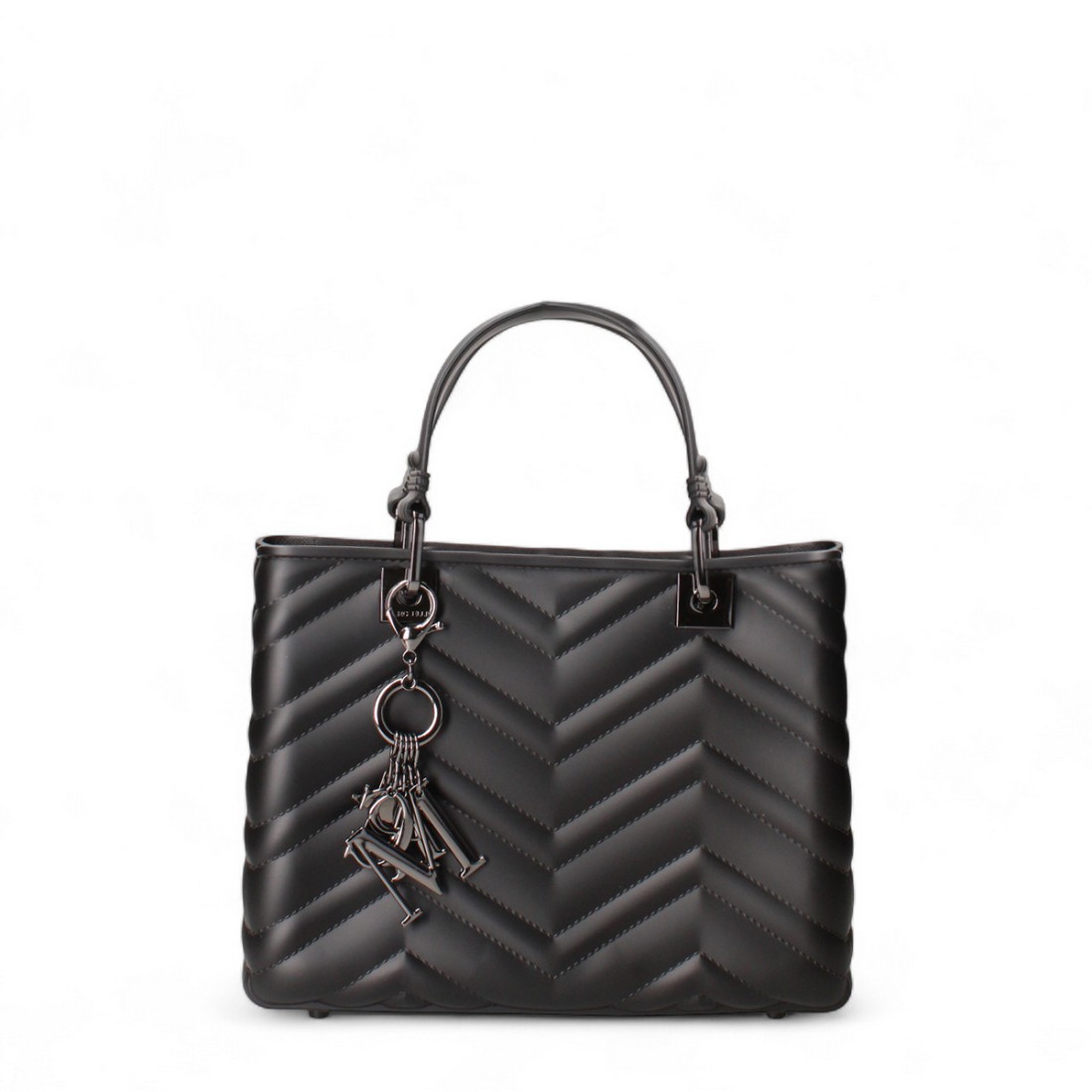 Descubra el bolso Marc Ellis en PVC negro con efecto acolchado ondulado, elegante y sofisticado. El charm con logotipo extraíble añade un toque distintivo, mientras que las asas dobles de PVC y la correa con logotipo extraíble ofrecen versatilidad. El cierre de solapa interior sin botones aporta practicidad, complementada con detalles chapados en oro. Compacto y funcional, mide 21x15x7 cm, perfecto para cualquier ocasión.