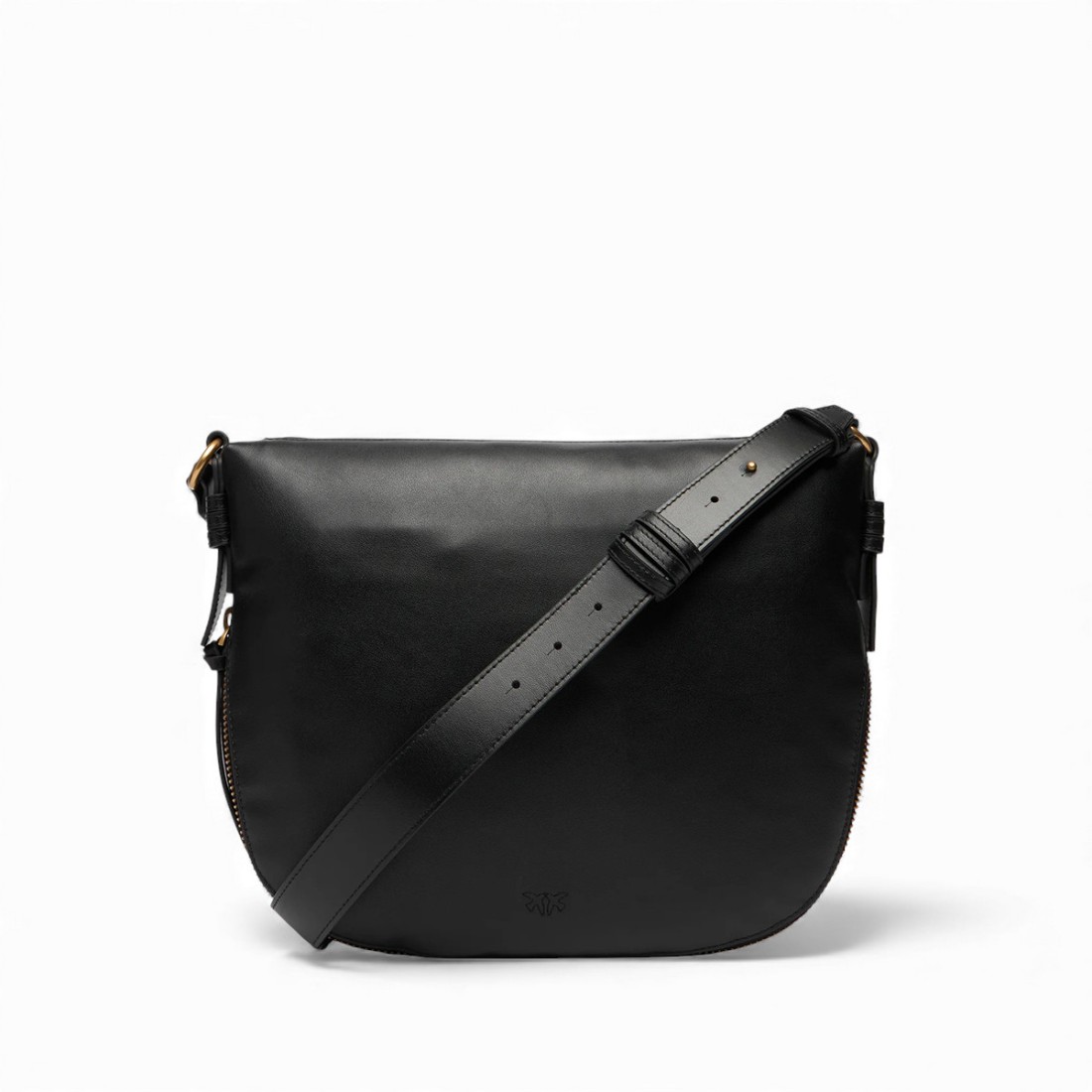 Bolso hobo mediano en suave piel, con un diseño versátil y práctico con cremallera. Con forro de algodón y correa ajustable para llevar al hombro o cruzado, es perfecto para acompañar cualquier look diario. El estilo motero y la hebilla Love Birds Diamond Cut realzan el carácter distintivo y la elegancia contemporánea de la marca PINKO. Dimensiones: 32x27x6 cm.