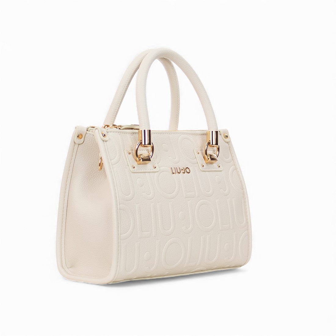 Pequeño bolso de mano Liu Jo en color blanco, confeccionado en suave polipiel. Compacto pero funcional, ofrece un compartimento principal con cierre de clip magnético, tres bolsillos con cremallera y un bolsillo plano. Con unas medidas de 24 x 20 x 10 cm, asas de 8 cm de altura y correa ajustable hasta 112 cm, es perfecto para el día a día sin renunciar al estilo.