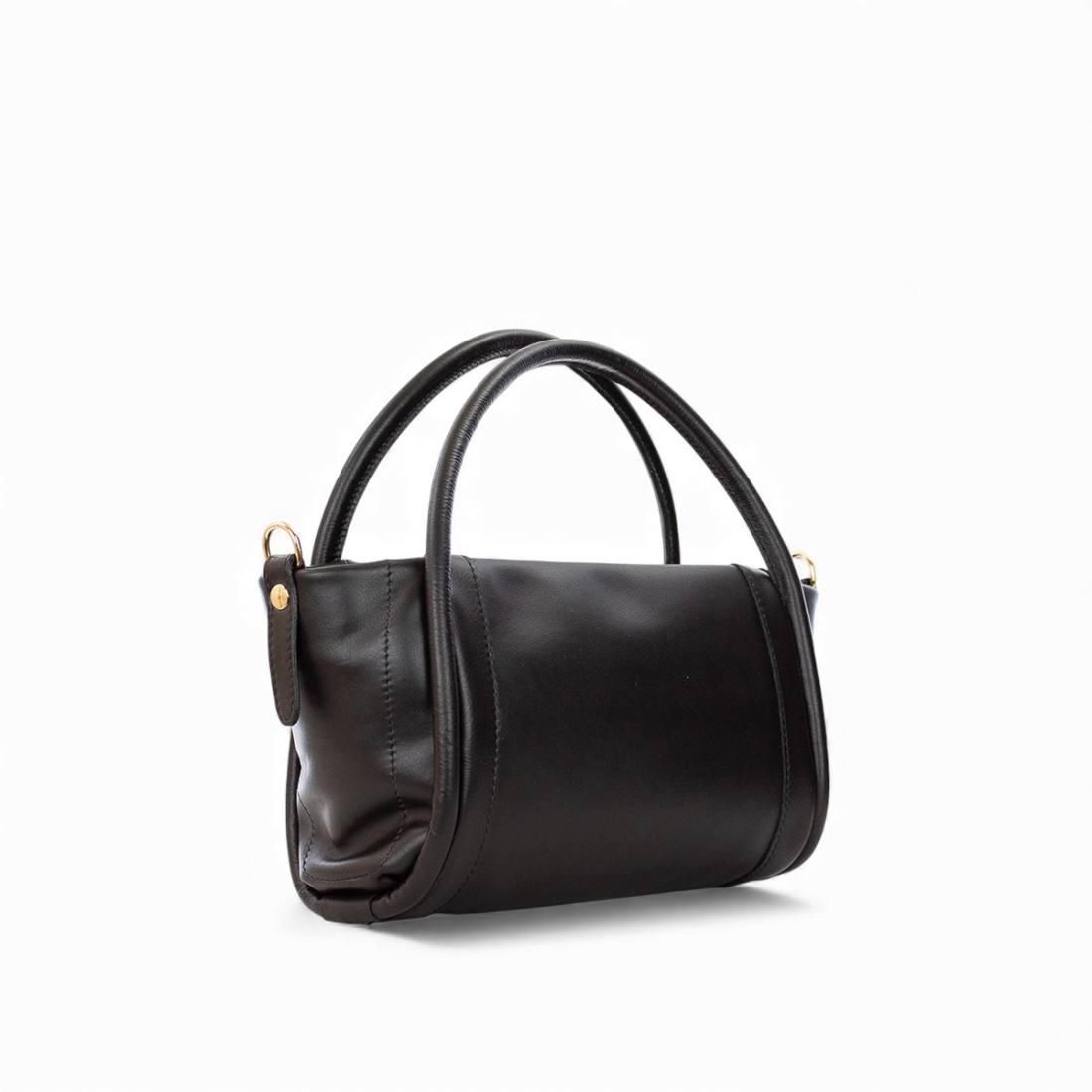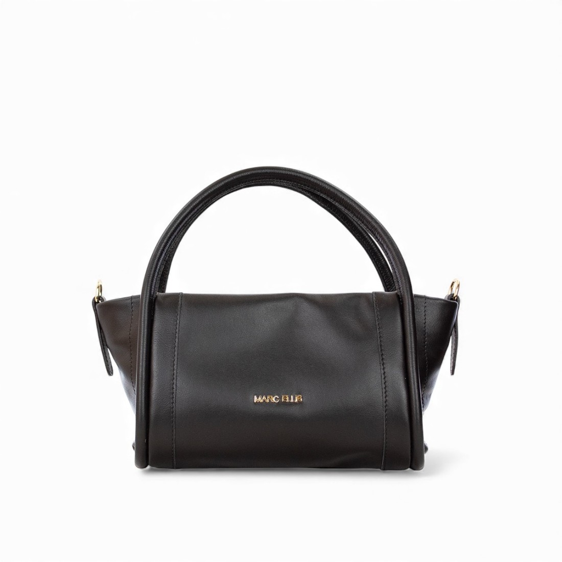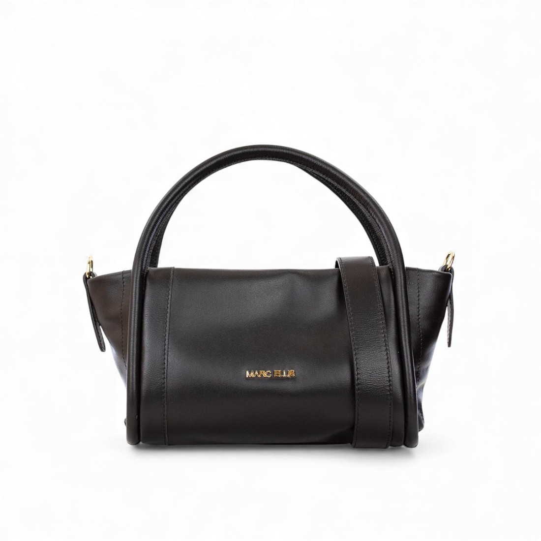 Bolso Marc Ellis en suave piel negra con detalles dorados y logotipo en letras en la parte delantera. Equipado con dos asas de piel y una de hombro, cierre de cremallera. Elegante y versátil, mide 25x16x12 cm.Nuestro servicio al cliente está disponible de lunes a sábado de 10:00 a 19:30