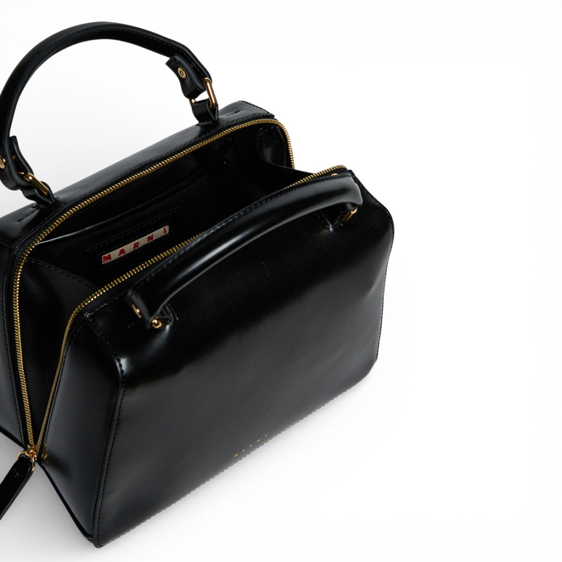 Bolso escolar MARNI de piel sintética revestida de color negro, con logotipo de letras en contraste en la parte delantera. Compacta pero espaciosa, está pensada para el uso diario gracias a sus prácticos bolsillos interiores y su cierre de cremallera. Equipada con una bandolera ajustable y desmontable, puede llevarse en la mano o colgada del hombro.