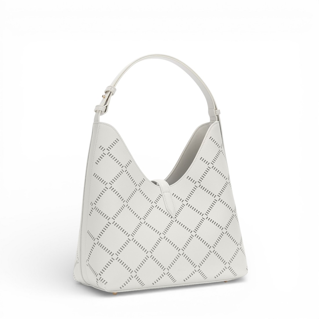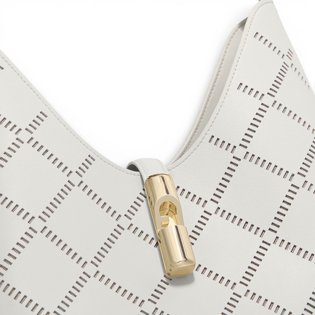 El bolso hobo Furla Goccia cautiva con su silueta suave y desestructurada en piel de becerro perforada malvavisco. El asa ajustable de piel en contraste se adorna con una correa a juego, mientras que los herrajes cilíndricos con peso y logotipo Arco firman el cierre. El interior, espacioso y funcional, ofrece un bolsillo abierto y otro con cremallera. Dimensiones: 30 x 30,5 x 16 cm.