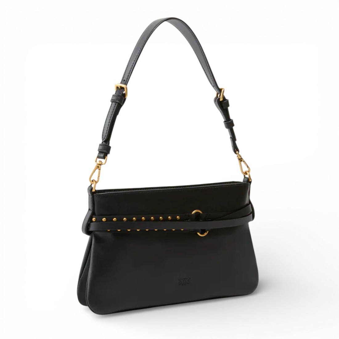 Compacta y refinada, la Riñonera Mini combina líneas limpias y fuerte carácter. Confeccionada en suave piel de vacuno negra, se distingue por el fino cinturón a juego con tachuelas redondeadas y hebilla circular Love Birds. Los anillos metálicos con el logotipo PINKO añaden un toque icónico. Con doble asa bandolera ajustable y extraíble, puede llevarse al hombro o cruzado. Interior forrado con bolsillo. Medidas: 27 x 16 x 2 cm.