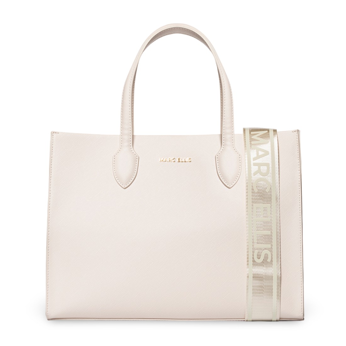 Bolso tote Ceylan MF de Marc Ellis en piel sintética efecto saffiano color leche, elegante y versátil. Logotipo con letras metálicas en la parte delantera. Equipado con doble asa y bandolera de tela con logotipo, ajustable y extraíble. Cierre con cremallera. Dimensiones: 36 x 27 x 15 cm. Perfecto para acompañarte cada día con estilo.