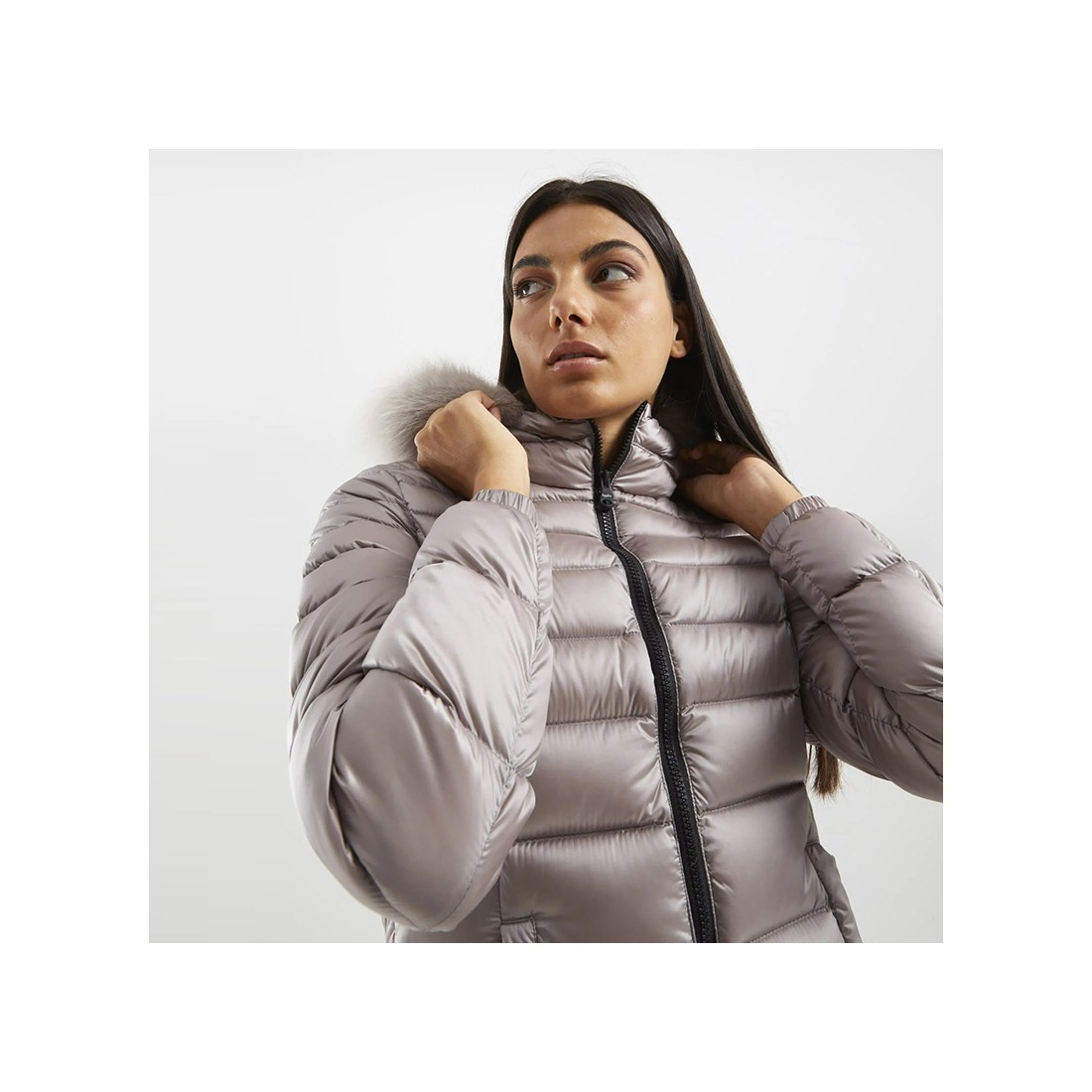 Chaqueta de plumón de invierno ¾ de mujer con pelo, elegante y cálida, perfecta para afrontar la estación fría con estilo. El relleno 100% plumón 90-10 de inyección directa garantiza ligereza y máximo confort. El tejido exterior de nailon satinado le da un toque femenino y moderno. Práctica, cómoda y una de las favoritas de nuestros clientes, es un auténtico must-have para el invierno.