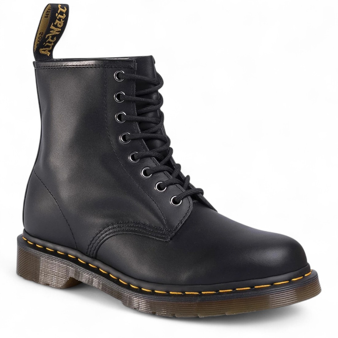 Descubra lasbotas militares Dr. Martens 1460 Nappa, un icono atemporal en suave piel negra brillante. El modelo de 8 agujeros con la clásica lengüeta AirWair en la parte trasera combina estilo y comodidad. La resistente suela de goma con pespuntes amarillos en contraste realza su diseño auténtico y descarnado, haciéndola perfecta para conjuntos informales o alternativos. Un modelo imprescindible para quienes buscan carácter y calidad sin concesiones.Nuestro servicio al cliente está disponible de lunes a sábado de 10:00 a 19:30