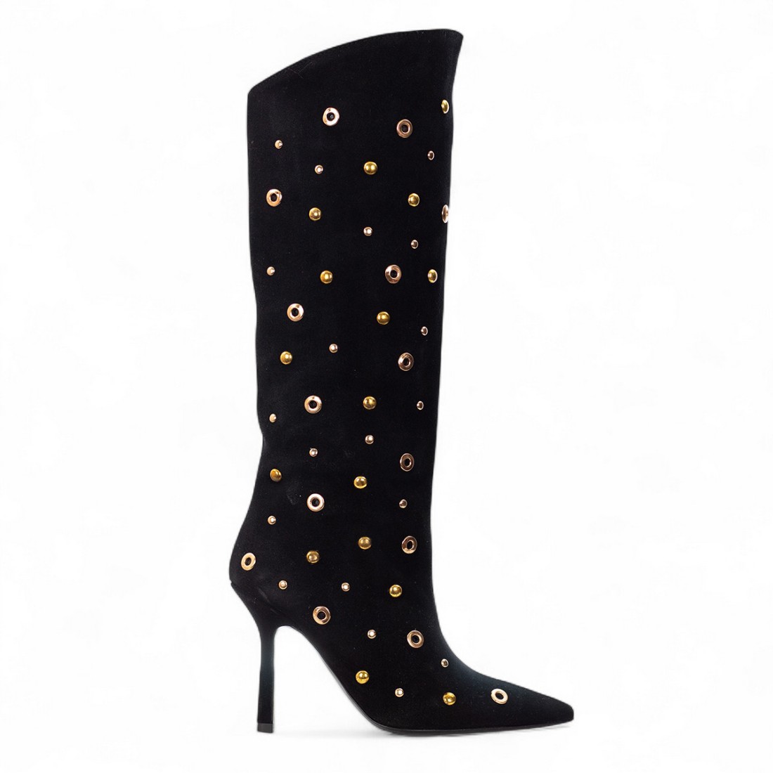 Botín largo Wo Milano en ante negro con tachuelas decorativas doradas por todo el contorno. Tacón de 100 mm, suela de goma resistente y caña de 37 cm. Interior forrado en piel para mayor comodidad y calidad, ideal para un look elegante y vanguardista, perfecto para completar conjuntos glamurosos en cualquier temporada.Nuestro servicio al cliente está disponible de lunes a sábado de 10:00 a 19:30